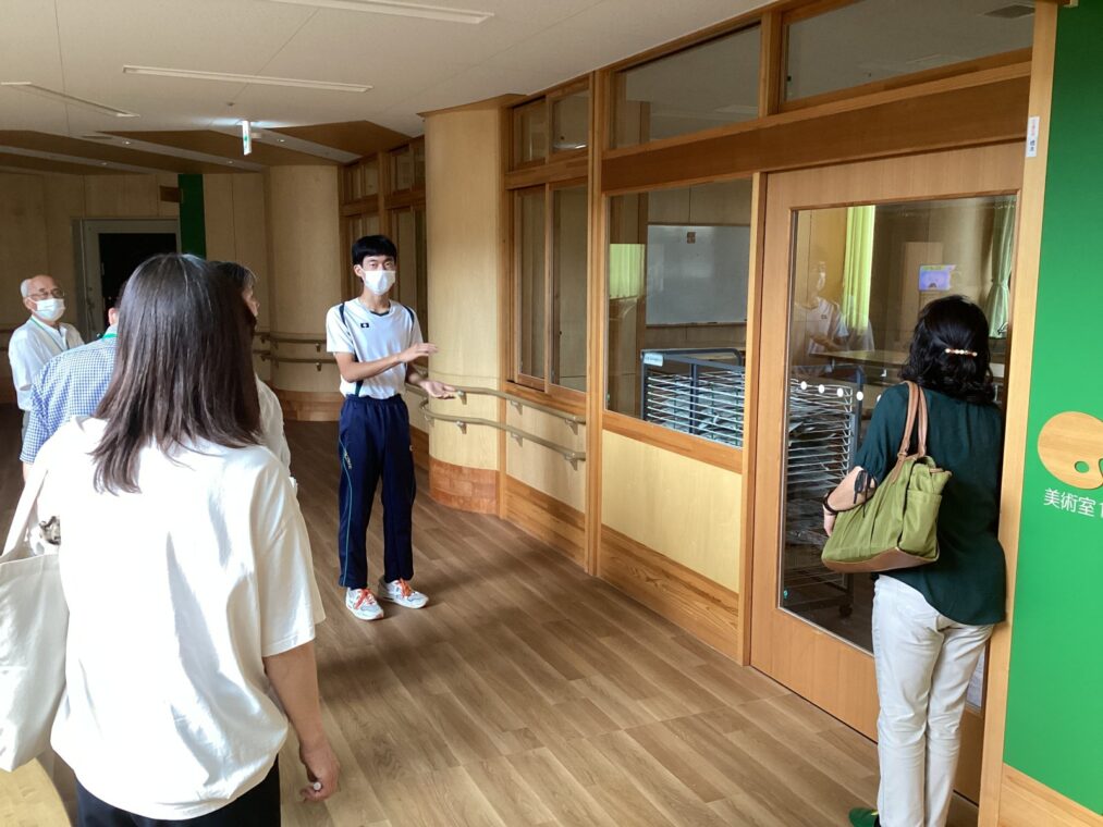 教員から本校の教育についての説明をさせていただいた後、くらしデザインコースの代表生徒が校内案内を担当しました。普段は支援を受ける立場の生徒たちが、今度は案内する側として堂々と活躍する姿に、民生委員の方々からはお褒めの言葉をいただきました。