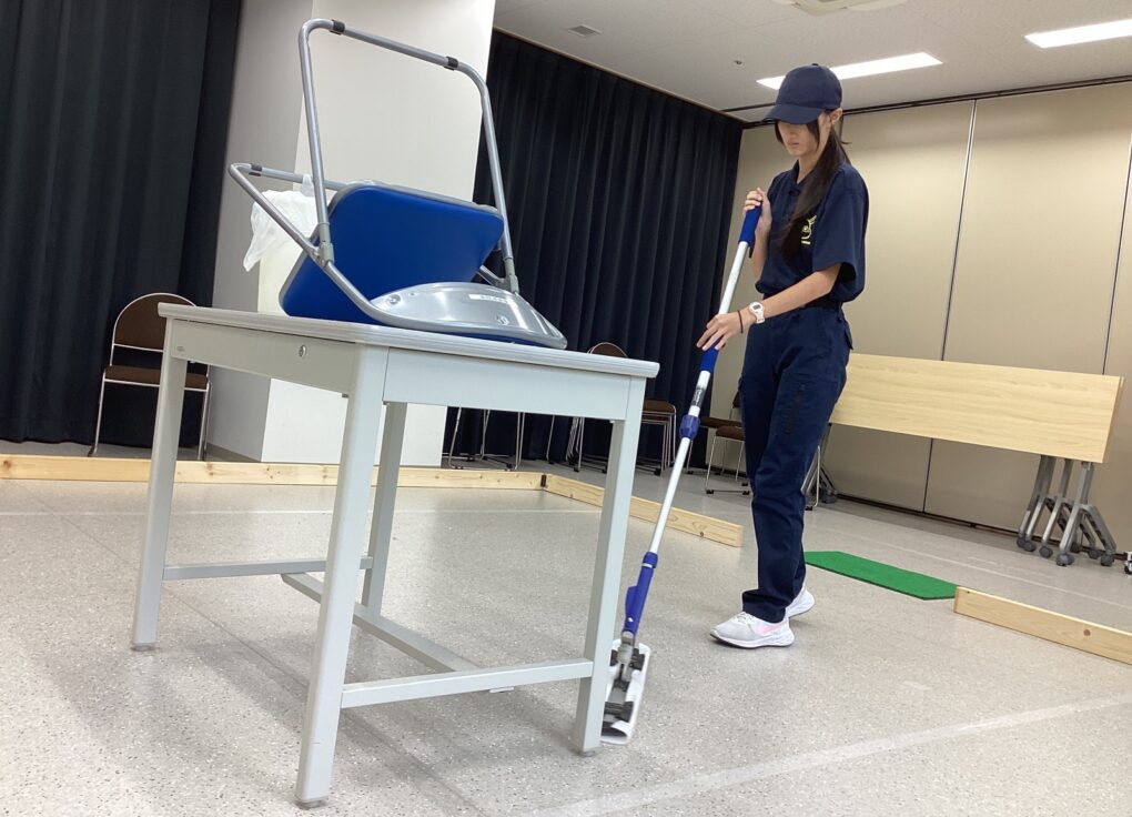どの種目も、1学期から取り組んできた清掃手技がベースになっているため、あとは定められた手順で適確に行うことです。複合種目については、一連の流れを意識しながら、制限時間内に完了することも求められます。