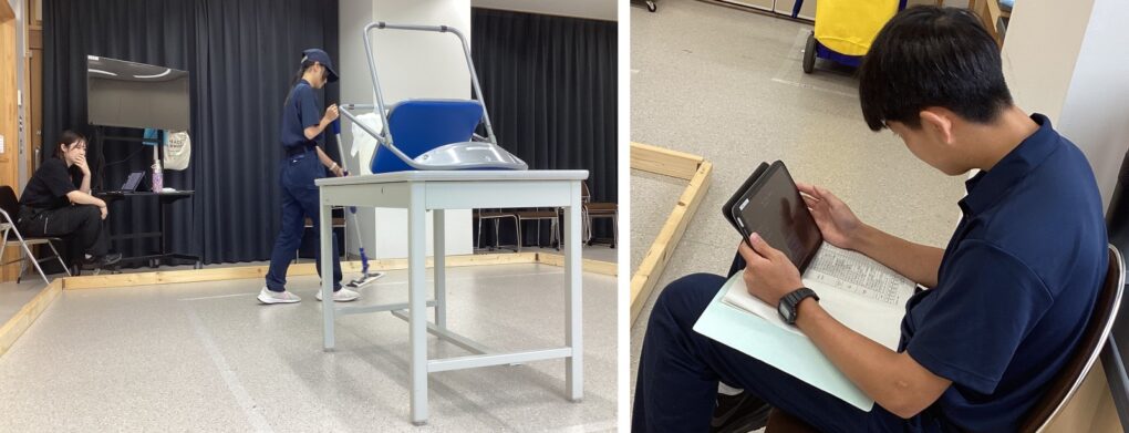 検定には、タオル、自在ほうき、乾式モップ、そしてこれらすべてを含む複合の種目があります。生徒たちは、自分がエントリーする種目について、マニュアルを確認しながら練習を進めています。