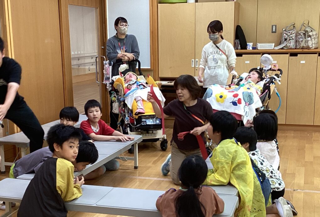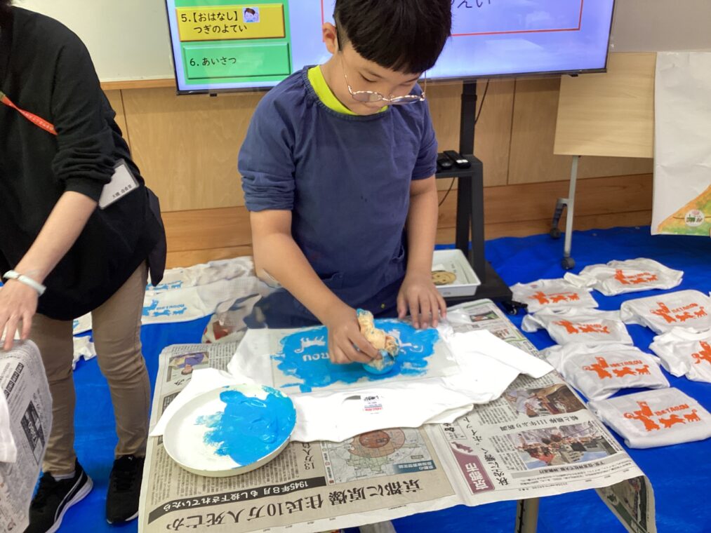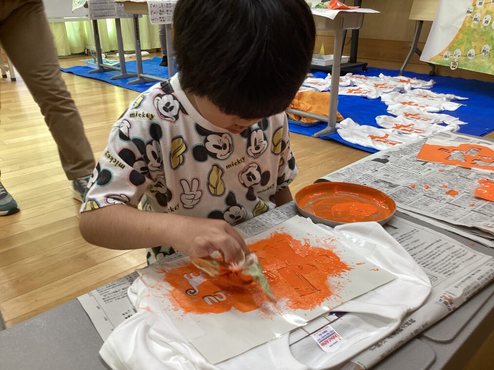 中学年は、やまぶき祭で使うTシャツづくりをしました。型紙を使ってTシャツに色を付けていきます。版がずれないように気を付けながら、ポンポンと色を付けていく作業は、集中力がいりますが、頑張って作業することができました。オレンジと水色で色づけたおそろいのTシャツをやまぶき祭で披露できるのが楽しみです。