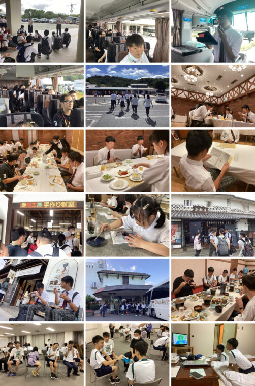 最初に訪れたのは、明治時代の倉敷紡績所の建物を保存・再利用した 倉敷アイビースクエア。赤いレンガに絡まるツタが印象的な建物に、生徒たちは目を輝かせていました。趣きのある食堂で瀬戸内の味を堪能した後は、絵付け体験へ。真剣な眼差しで筆を握り、一人ひとりが思い思いの絵柄を器に描いていました。焼き上がった作品は後日学校に届く予定です。どんな仕上がりになるのか、今から楽しみです。その後は、白壁の蔵屋敷や柳並木が美しい倉敷美観地区の散策へ。風情ある町並みをゆっくりと歩き、思い出の写真をたくさん撮りました。一泊目の宿では、生徒たちが企画した夜の集いを行いました。準備してきたクイズとレクリエーションで会場は大盛り上がり。充実した一日を終え、二日目への期待を胸に眠りにつきました。