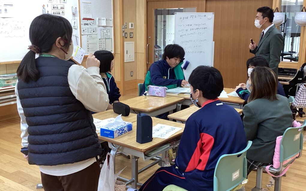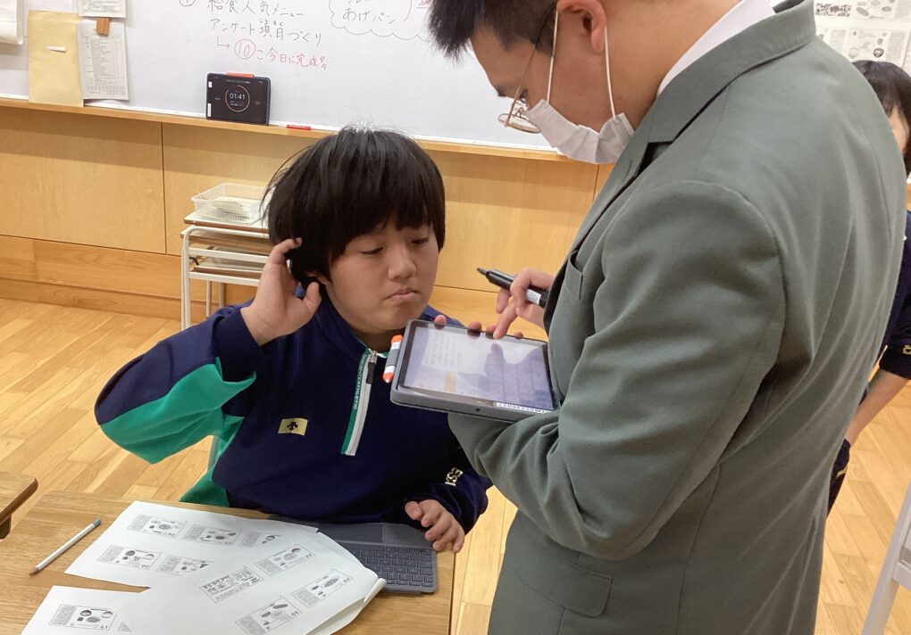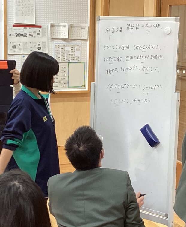 保健給食委員会では、給食の人気メニューアンケートの作成に取り組んでいました。担当教員によるアドバイスを受けながら、生徒間でたくさんの意見が交わされていました。