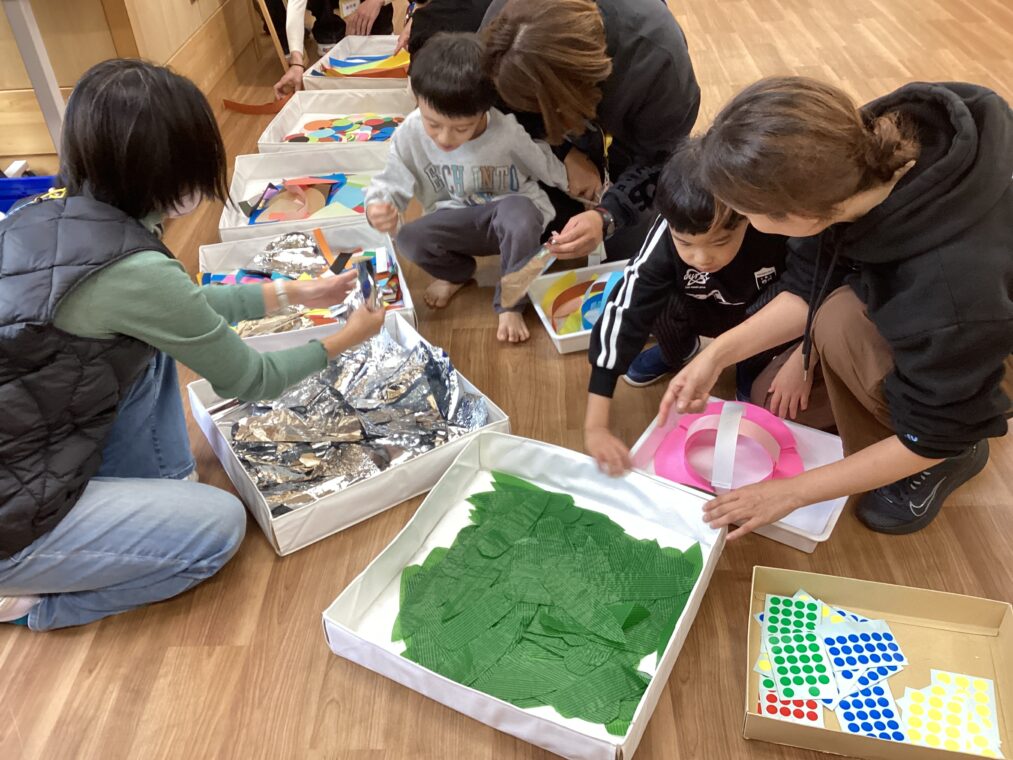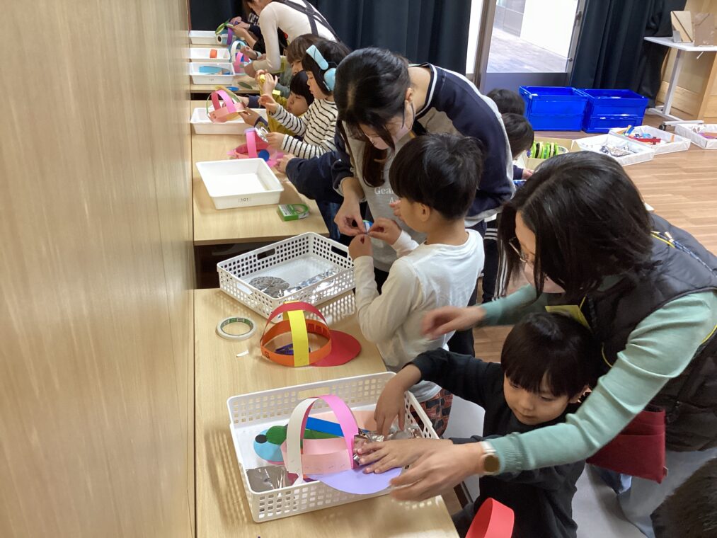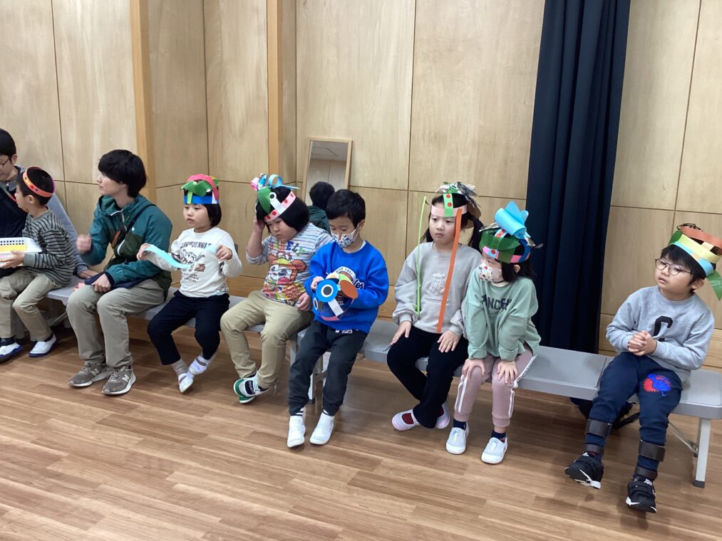 今日は、低学年が体験をしました。低学年は、クラスごとに順に体験していくということで、今日と19日の2回に分けて実施します。今日は、「紙の帽子工作」を体験しました。用意していただいたいろいろな色の帽子の枠から好きな物を選び、その枠にいろいろな飾りをつけていきます。つけていく飾りもいろいろな種類を用意してもらっていて、どれを使うか悩みながらホッチキスや両面テープ等を使ってつけていきました。出来上がると、鏡をのぞいて確認している児童もいました。