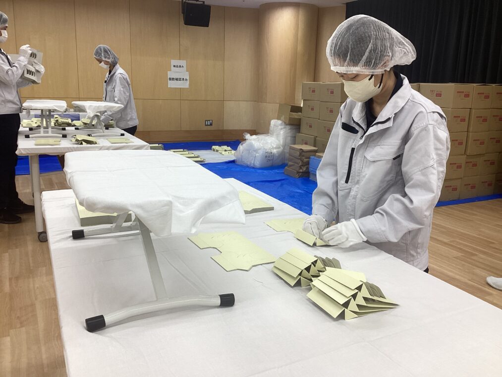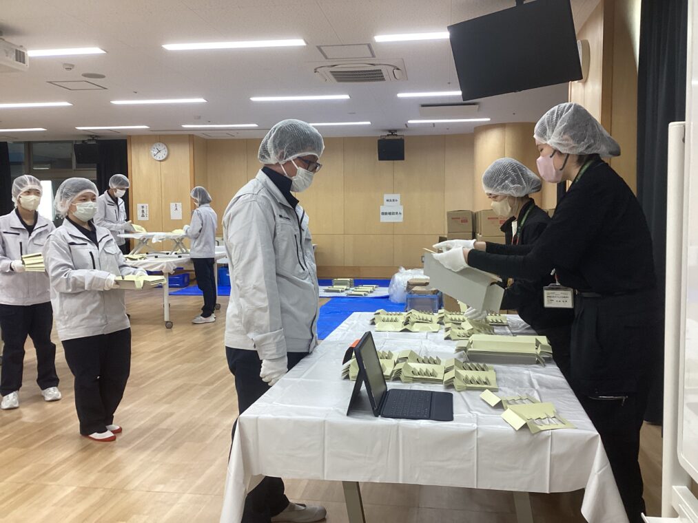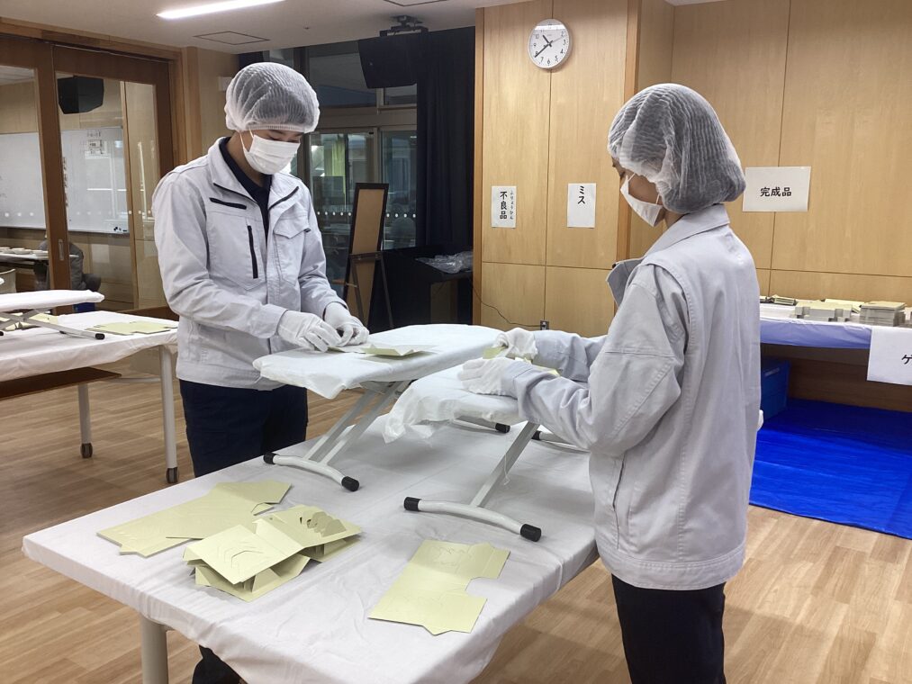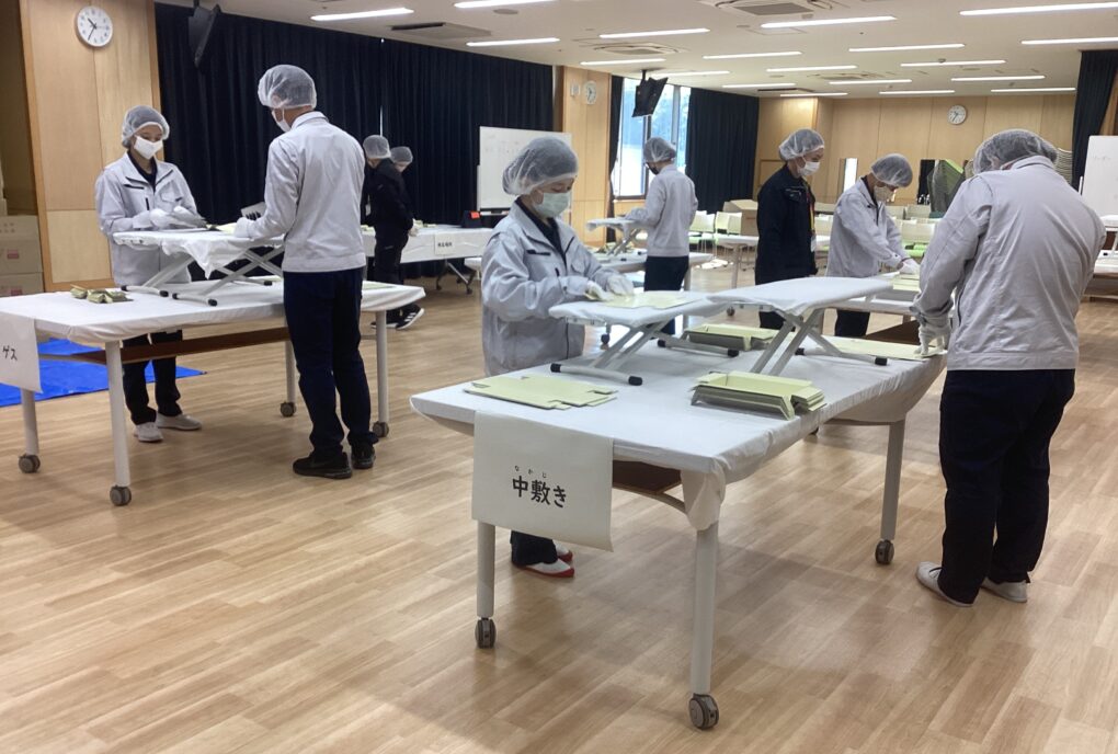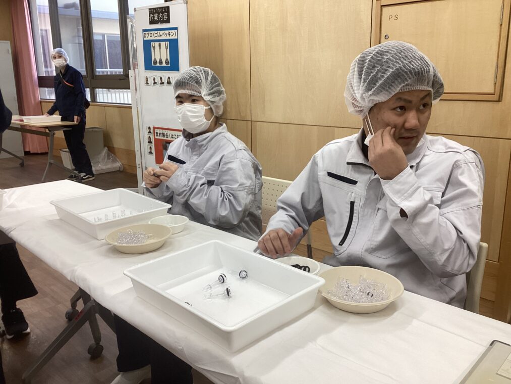 初日の今日は、中学部進路説明会があり、中学部の保護者の方々が見学に来られました。たくさんの視線を感じながら、生徒たちは緊張した面持ちで作業に取り組み、一つひとつの作業を丁寧に進めようとする姿が見られました。