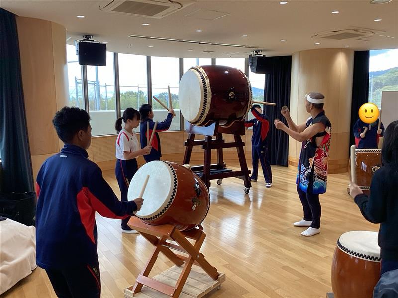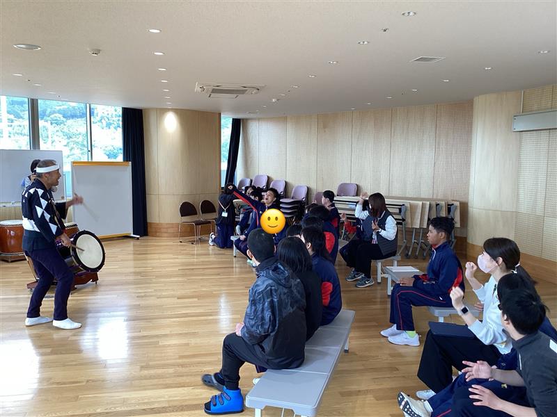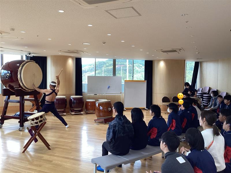 中学部の様子本日、中学部では「学校アート出会いプロジェクト」として和太鼓の体験を行いました。「ヨイサ!」「ドッコイショ!」「ソーラン!」と合いの手が響き渡り、会場が一体となる雰囲気に包まれました。特に大太鼓の迫力ある音は、身体に直接響き渡り、生徒もその力強さに圧倒されていました。生徒たちは実際にバチを持ち、太鼓を打つ体験を通して、和太鼓の楽しさを感じることができました。心と体に響く貴重な時間となり、和太鼓の魅力を存分に味わう一日となりました。