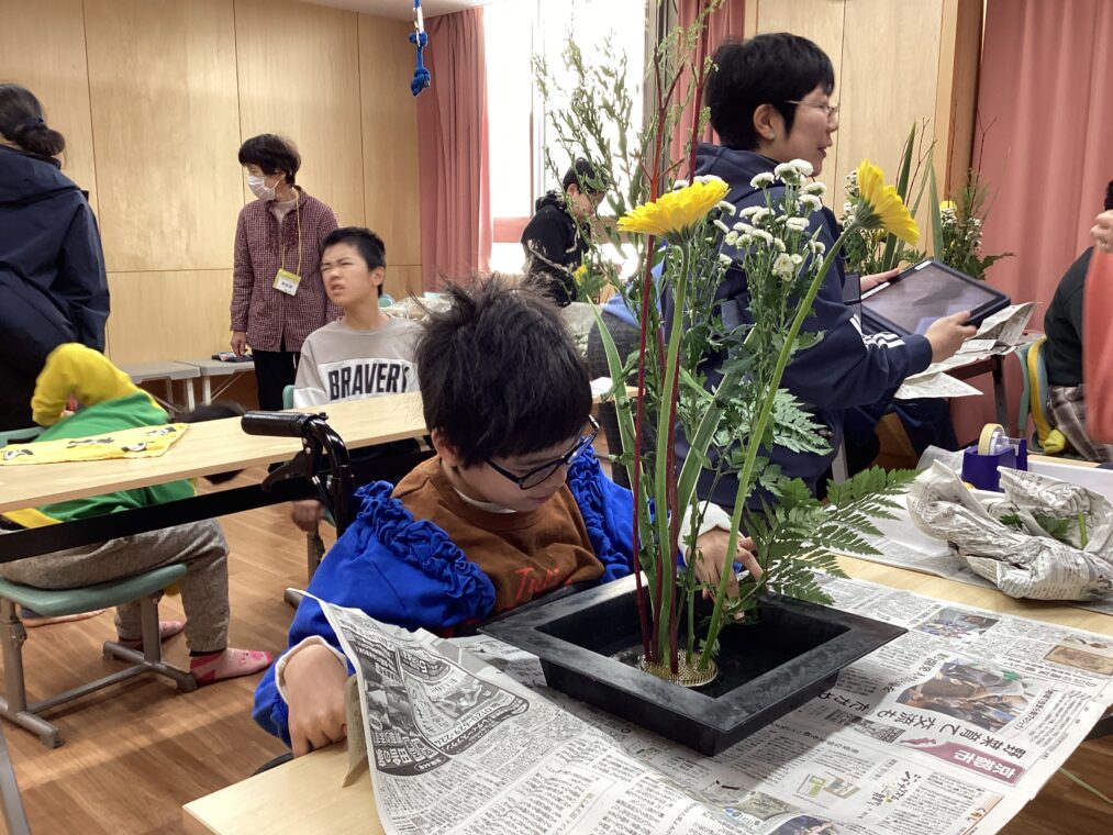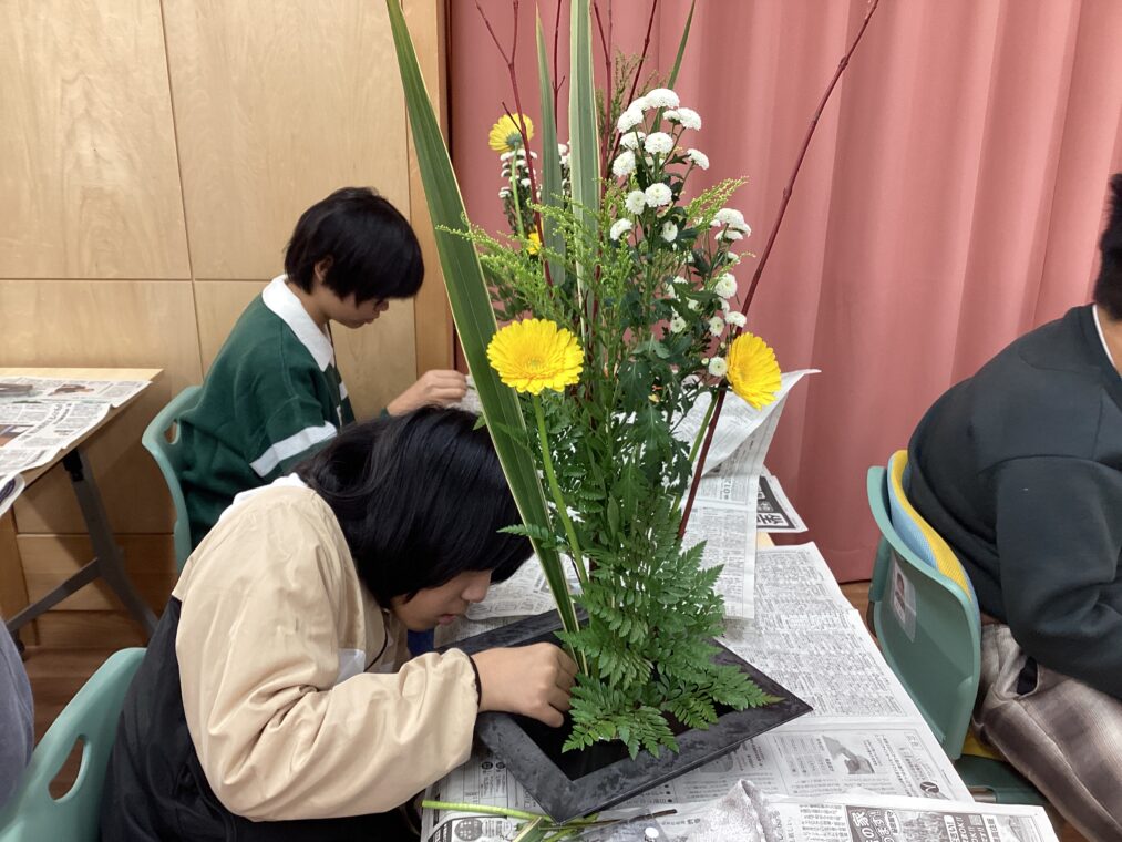 小学部の様子今日は高学年の児童が、「文化の心次世代継承事業(学校・いけばな・出会いプロジェクト)」で、いけばなの先生をお迎えして「いけばな体験」を行いました。まず先生から、花の扱い方や剣山の使い方について丁寧に教えていただきました。話を聞いた後は、一人一人、自分で花材を選び、剣山にしっかりと挿して形を整えると、個性豊かな作品が次々と完成しました。仕上がった後は、みんなで作品を並べて鑑賞会も行いました。花と向き合う時間をとおして、集中する楽しさや表現する喜びを味わうことができた、心温まる体験となりました。