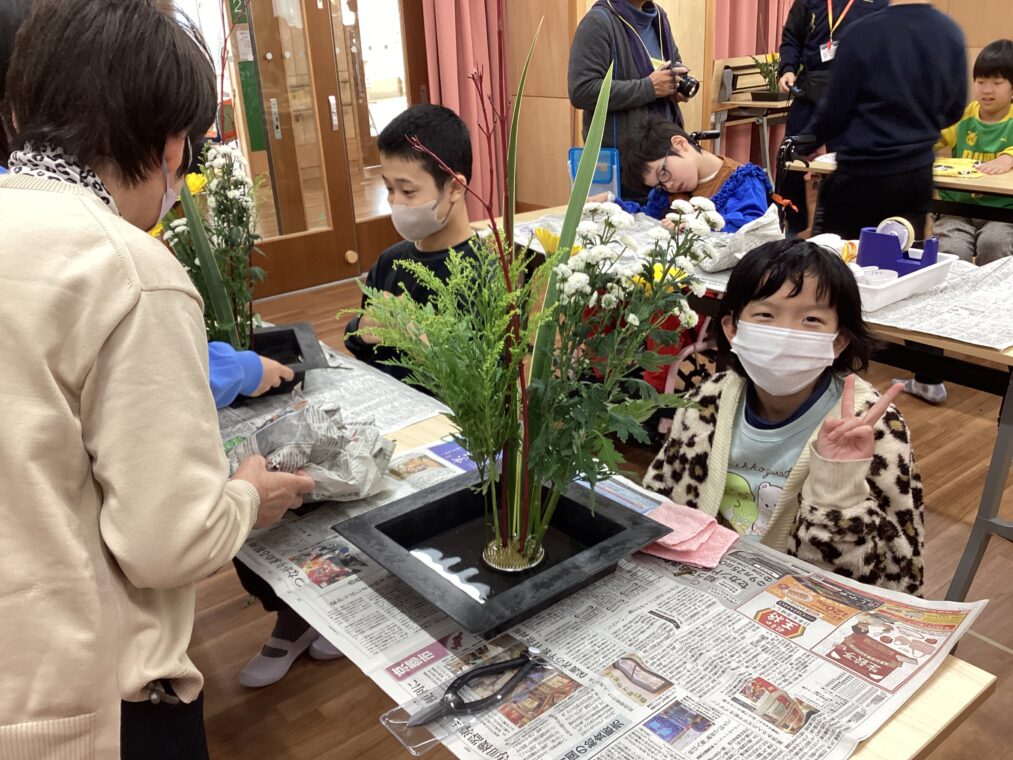 今日は高学年の児童が、「文化の心次世代継承事業(学校・いけばな・出会いプロジェクト)」で、いけばなの先生をお迎えして「いけばな体験」を行いました。まず先生から、花の扱い方や剣山の使い方について丁寧に教えていただきました。話を聞いた後は、一人一人、自分で花材を選び、剣山にしっかりと挿して形を整えると、個性豊かな作品が次々と完成しました。仕上がった後は、みんなで作品を並べて鑑賞会も行いました。花と向き合う時間をとおして、集中する楽しさや表現する喜びを味わうことができた、心温まる体験となりました。