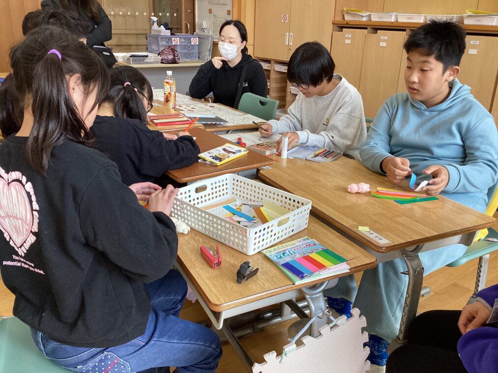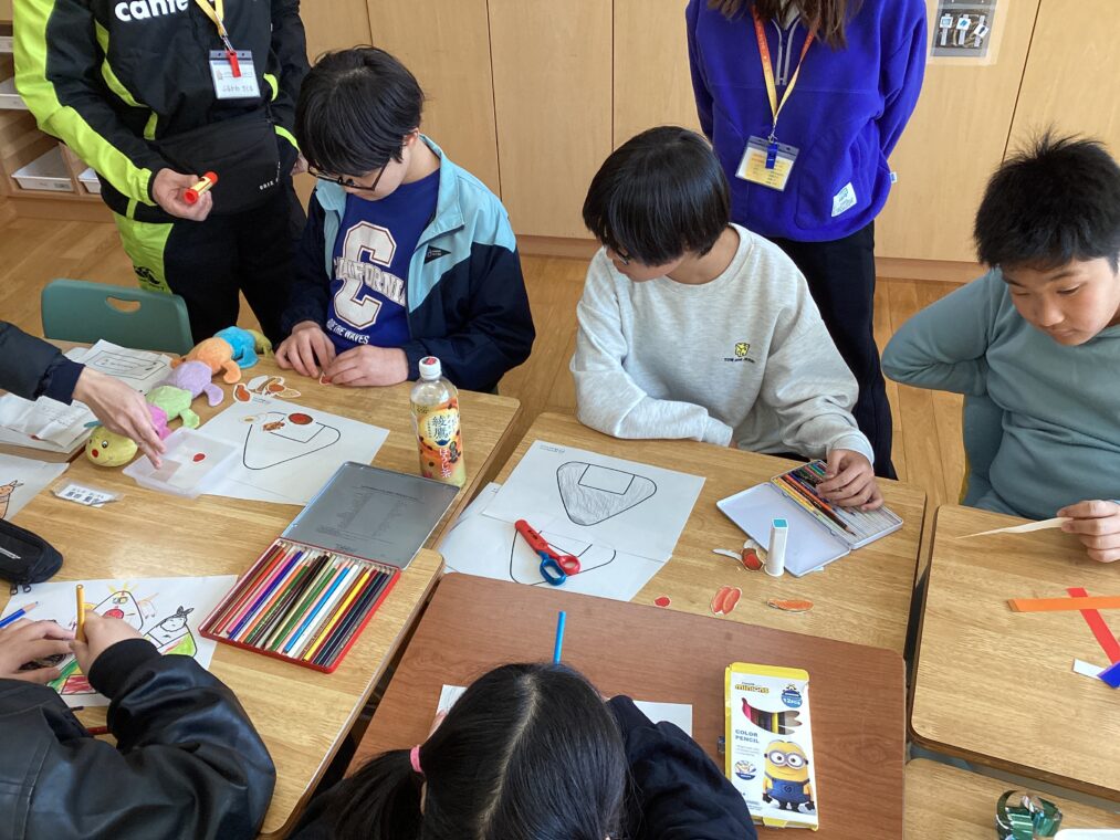 小学部の様子11月7日から始まった、小学部6年生と中学部2年生との「学部混合むすびスタディ」。合同での授業のほかに、6年生だけの学習でも準備を進めています。今日は、「おむすびカフェ」のお店の飾りとして、和飾りやおむすびのイラストを作ったり、おむすびカフェへの招待状を書いたりしました。明日は、校内の先生が参観に来て見てもらいます。徐々に形になっていく「おむすびカフェ」。当日が楽しみです。