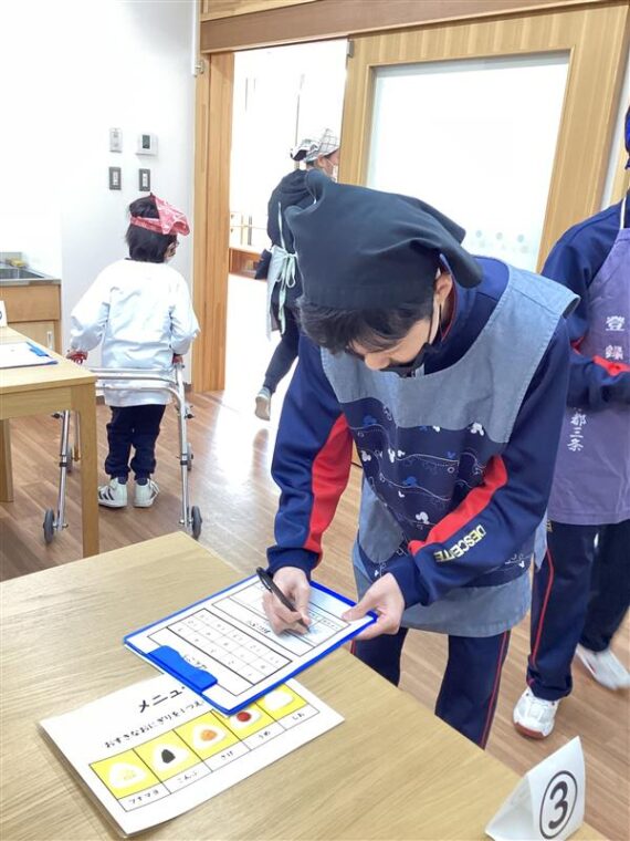 中学部の様子本日の「混合むすびスタディ」では、小6と中2の生徒が協力しながら活動を行いました。中2の生徒は後輩に見本を示し、リーダーシップを発揮して役割分担を進めました。注文を取る人、おにぎりを作る人、接客をする人とそれぞれが役割を担い、互いに思いやりを持って取り組む姿が見られました。おもてなしの心を大切にしながら、笑顔で対応する姿はとても頼もしく、学年を越えた交流を通して、協力する喜びと責任感を学ぶ貴重な時間となりました。