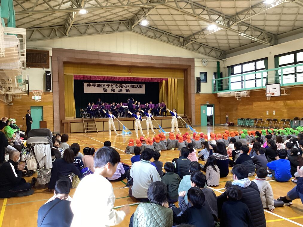 本日、中学年の児童が井手地区子ども見守り隊安心・安全啓発運動のパレードに参加してきました。京都府警察音楽隊や騎馬隊等の後ろにつづいて、JR玉水駅前から井手小学校までの間を井手小学校児童と一緒に歩きました。井手小学校では、体育館で式典に参加し、京都府警察音楽隊の演奏とカラーガード隊の実技を鑑賞してきました。普段はできない貴重な体験ができました。