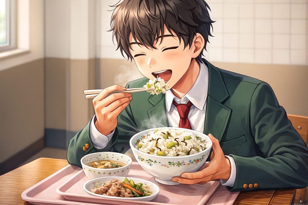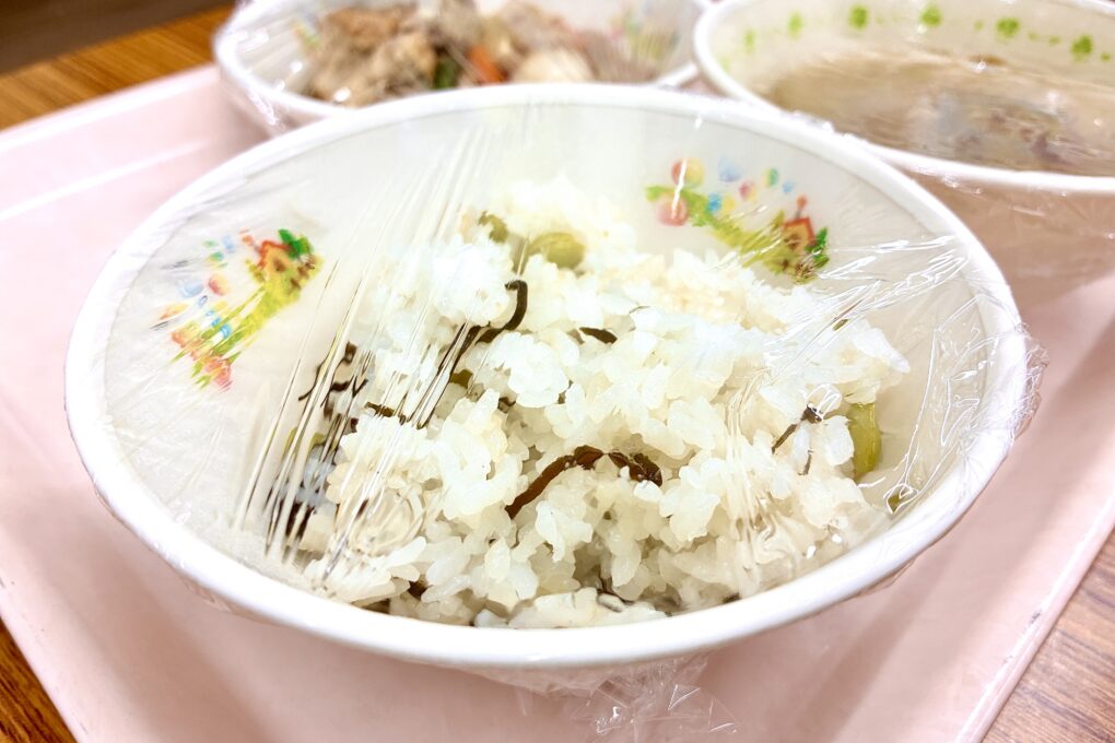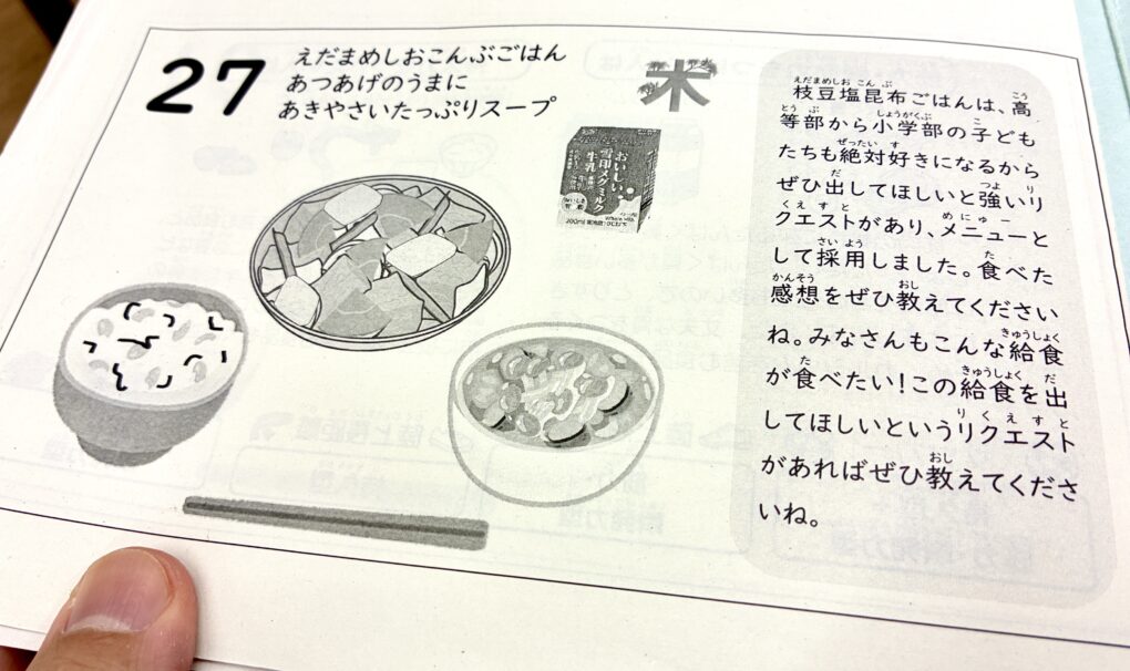 今日の給食メニューの一つ「枝豆塩昆布ごはん」は、昨年度、ある高等部生の熱烈なリクエストから生まれたメニューです。レシピも持参して、栄養教諭の先生に熱く思いを語ったといいます。