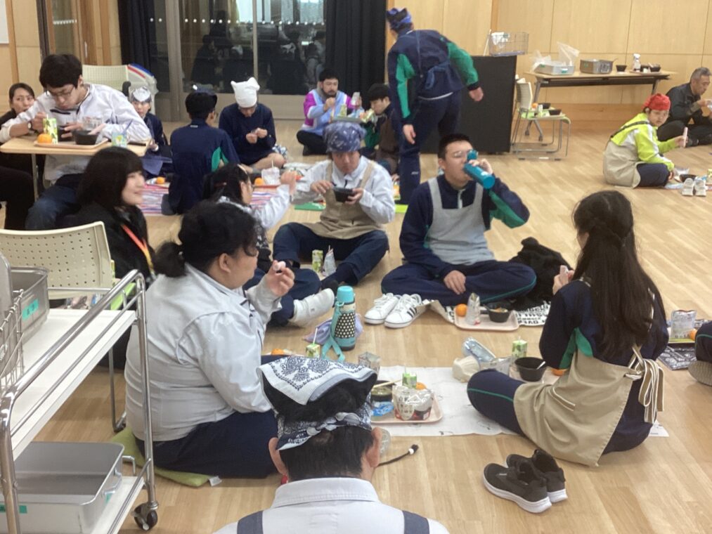 総合防災訓練を実施しました。午前中は全校で地震を想定した避難訓練を行い、災害時の基本行動を確認しました。昼食は防災給食として、高等部全員がランチルームに集まり、床にシートを敷いて食べました。