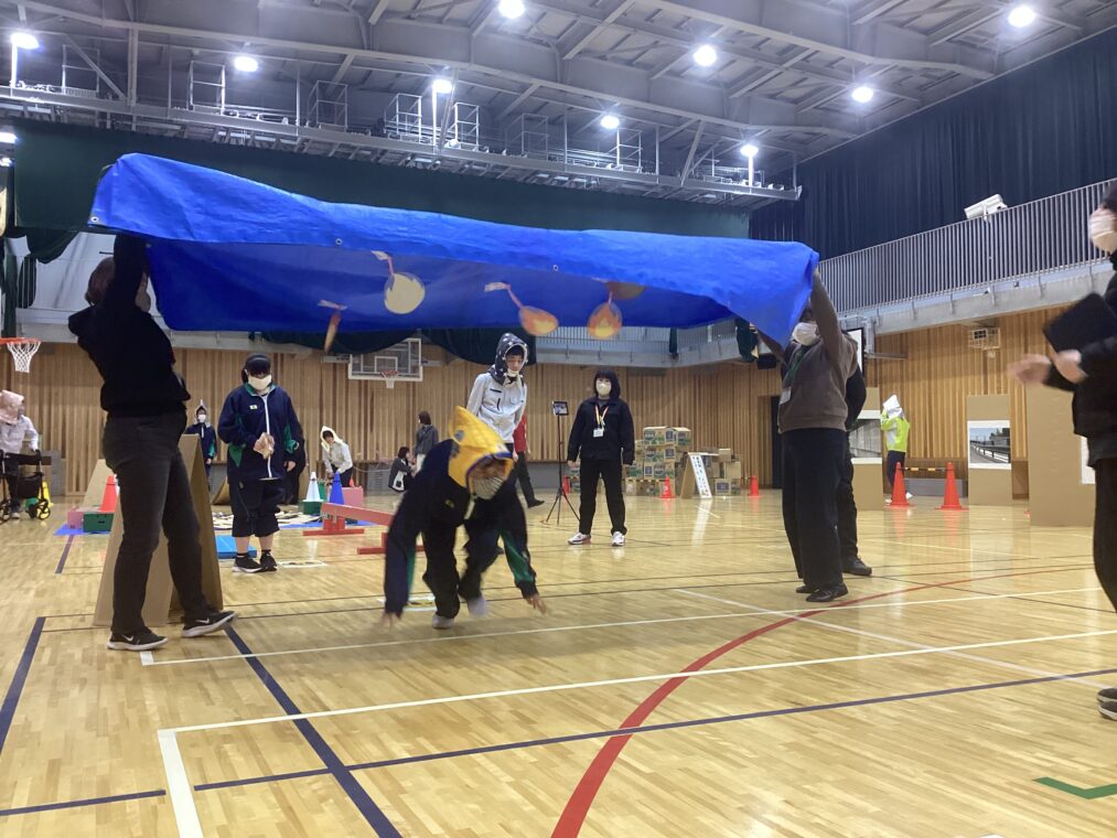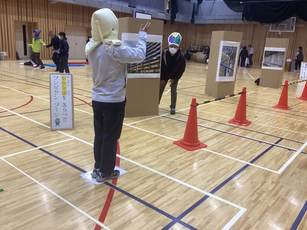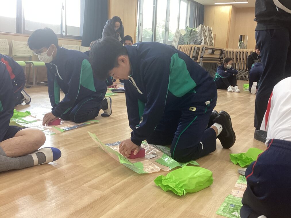 午後からは、コース別に分かれて実践的な防災学習に取り組みました。くらしデザインコースでは「あそぼうさい」を体験。災害時に動ける体づくりを目標に、地震時の安全な道を判断する区間と、段ボールが散乱した足場の悪い道や狭い通路を進む運動区間を組み合わせたサーキットコースに挑戦しました。危険な道を選ぶとゾンビが出てくる場面もあり、生徒たちは楽しみながら危機判断能力と身体能力を養いました。みらいデザインコースは、京田辺消防署の指導のもと「心肺蘇生法」のやり方を教わり、練習キットで練習しました。