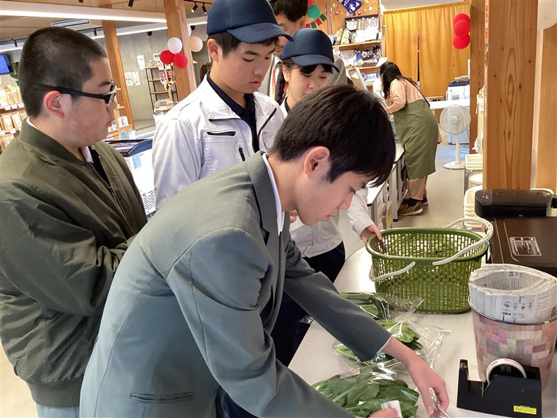 本日の作業学習では「Oide農園」での活動を行いました。午前中は高等部の先輩と一緒に収穫した野菜を袋詰めし、「いらっしゃいませ」のポップを作るなど販売準備を進めました。午後からは「テオテラスいで」に野菜を納品し、販売のお手伝いを体験。ポップを掲げてお客様に声をかけたり、商品を並べたりする中で、働くことの楽しさや先輩の姿に憧れを抱くなど、貴重な学びとなりました。