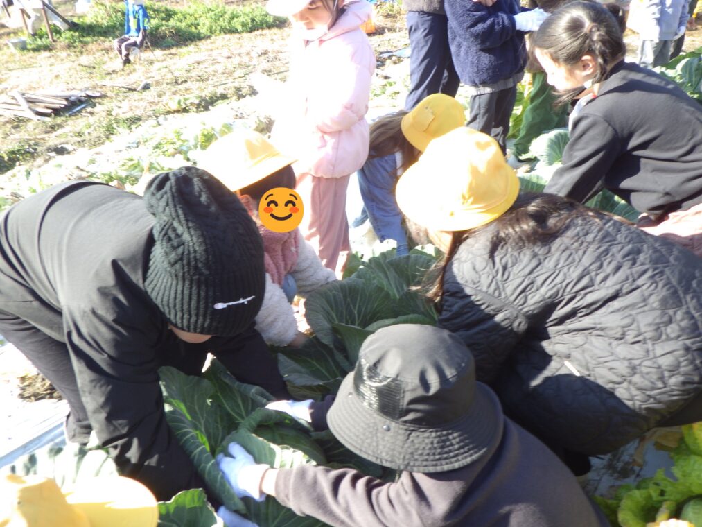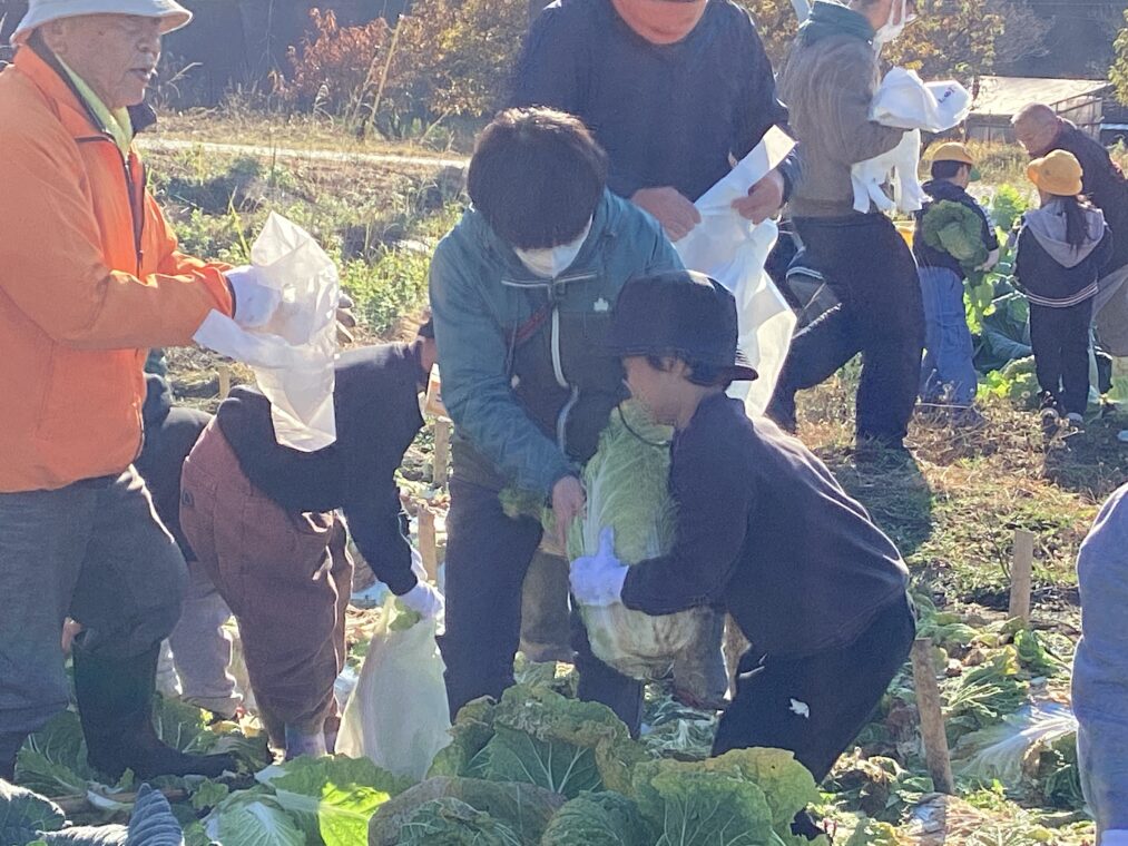 小学部の様子16日、低学年の5・6組児童が、井手町まちづくりセンター椿坂で、冬野菜の収穫体験をしました。種まきのときは、学校行事と重なり参加できませんでしたが、多賀小学校の児童が、井手やまぶき支援学校の児童の分も一緒にまいてくれていました。大きな白菜の収穫はカマを使うため、椿坂の方にお世話になりました。顔よりも大きな白菜を持たせてもらい、大満足な表情でした。白菜収穫の後は、キャベツの収穫も行いました。多賀小学校の児童とペアになり、力を合わせて大きなキャベツを収穫することができました。