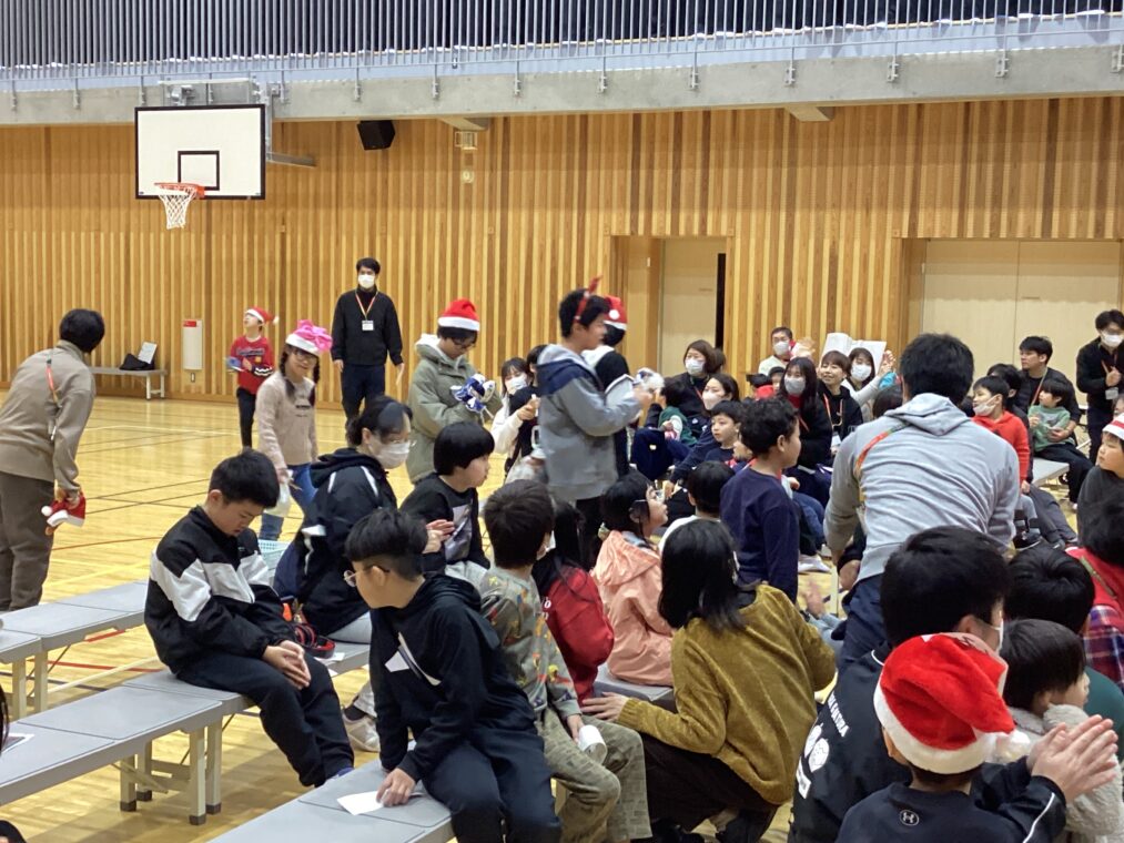 今日は、小学部全員で学部集会(クリスマス集会)をしました。5・6年生の司会のもと、あいさつをした後は、まずはサンタの登場!サンタやトナカイの帽子などを被った高学年が、それぞれのクラスにプレゼントを配ってくれました。その次に、全員で小学部ダンスを踊り、クリスマスツリーに各クラスで用意した飾りを付けていきました。最後は、低学年の発表。クリスマスの音楽に合わせて鈴を鳴らしたりマラカスを鳴らしたりすることができました。小学部全員で過ごす楽しいひとときになりました。