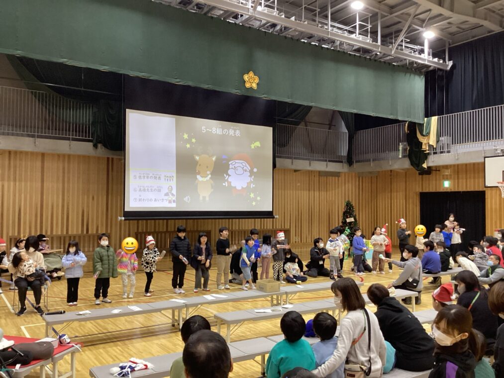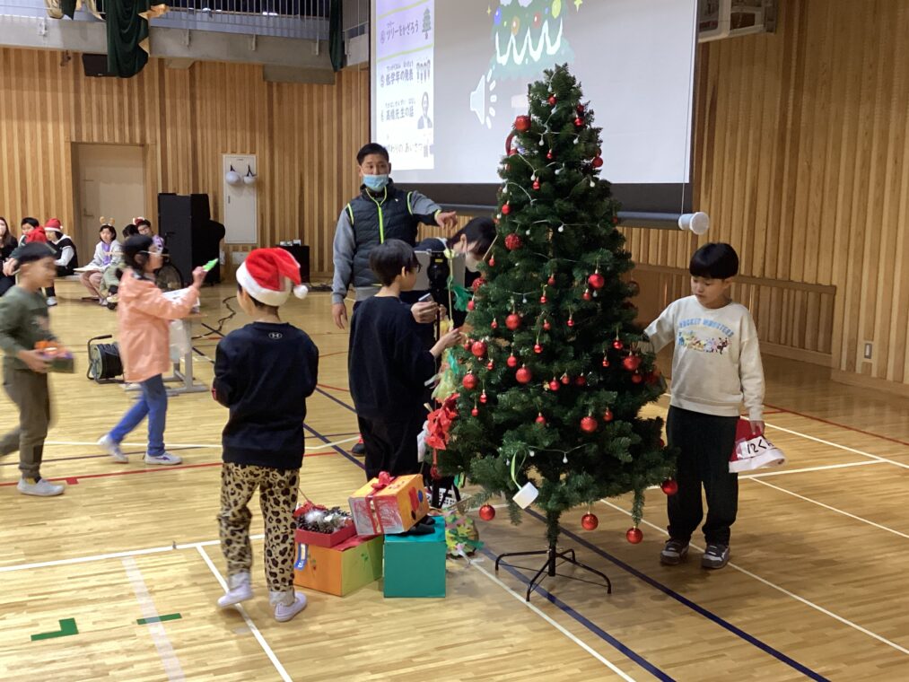 小学部の様子今日は、小学部全員で学部集会(クリスマス集会)をしました。5・6年生の司会のもと、あいさつをした後は、まずはサンタの登場!サンタやトナカイの帽子などを被った高学年が、それぞれのクラスにプレゼントを配ってくれました。その次に、全員で小学部ダンスを踊り、クリスマスツリーに各クラスで用意した飾りを付けていきました。最後は、低学年の発表。クリスマスの音楽に合わせて鈴を鳴らしたりマラカスを鳴らしたりすることができました。小学部全員で過ごす楽しいひとときになりました。