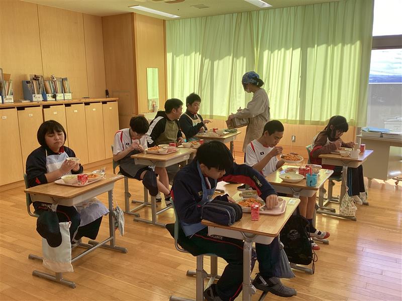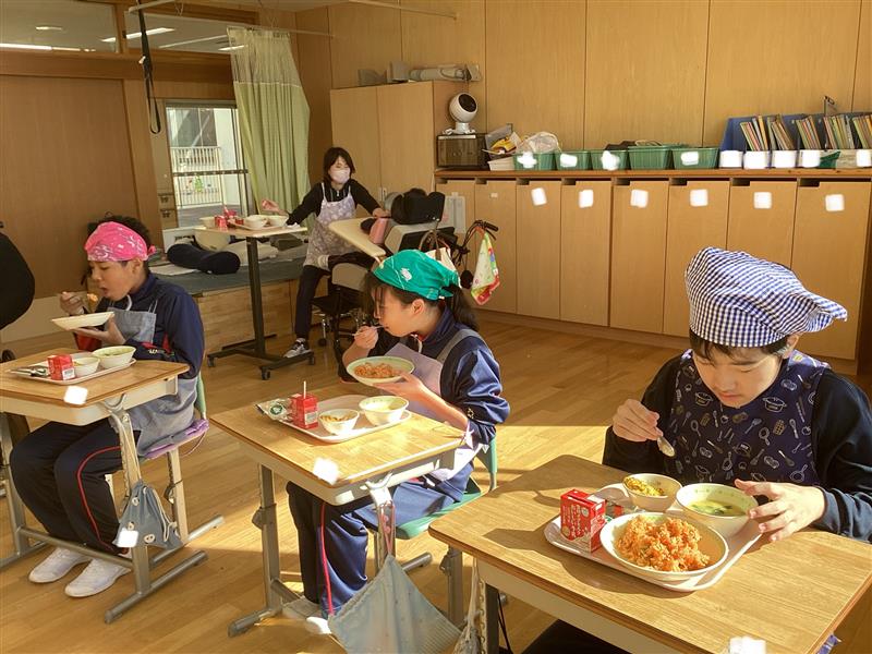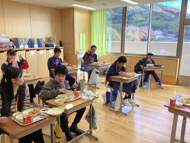 中学部の様子今日は、2学期最後の給食でした。特別な日を彩る「クリスマス献立」で、子どもたちは笑顔いっぱい!メニューは、チキンライス、タンドリーチキン、温かいコーンスープ、そして牛乳。さらに、クリスマスデザートとして「工房あんじゅ」さんが心を込めて作ってくださったケーキが登場しました。みんなで季節を感じながら楽しく食事をする、幸せな時間となりました。3学期も元気にスタートできるよう、しっかりエネルギーをチャージできたかな。