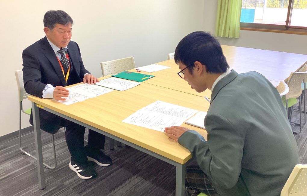 3学期の初日から、一人一人への事前指導が進められています。実習先への行き方、持ち物、実習中の注意事項など、それぞれに用意されたプリントを見ながら、丁寧に確認していきます。生徒たちは、プリントを見ながら真剣に説明を聴き、一つ一つうなずき理解していました。可能な生徒は聞いたことをメモ帳に書き、わからないところや不安なことがあれば質問し、しっかりと見通しをもって臨もうとする姿が印象的でした。