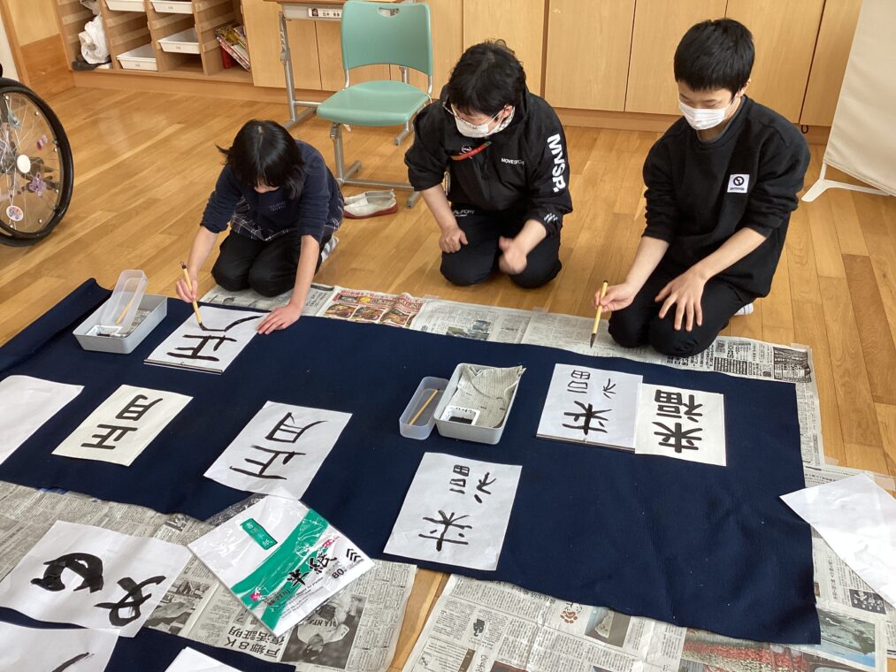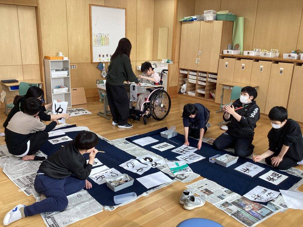 小学部の様子5年生が、授業の中で書き初めをしました。半紙や長い書き初め用の半紙に、自分で選んだ文字を書きます。最初は筆の持ち方や筆圧に戸惑っていましたが、2枚、3枚と書き進めるうちに、筆圧のかけ方がわかり、太さのある大きな文字を書くことができました。文字を書いた後は、小筆を使って自分の名前を書き入れます。太い筆と細い筆の2種類の筆を使い分けて書くことができました。昔から伝わる日本の文化を体験することができました。