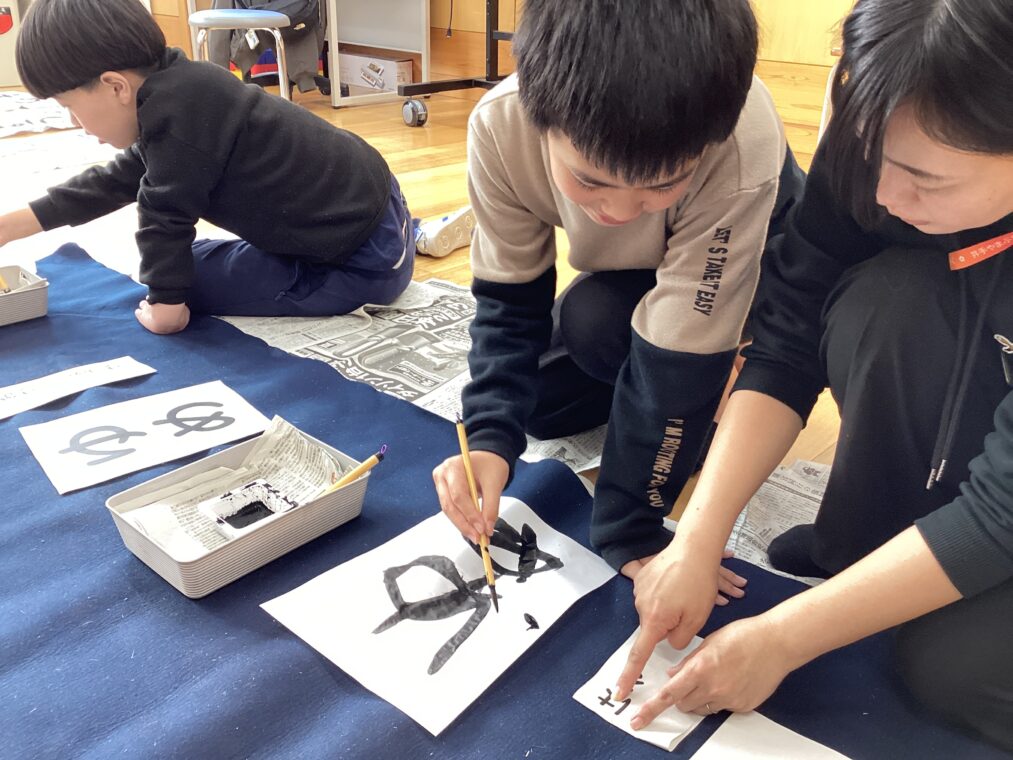 5年生が、授業の中で書き初めをしました。半紙や長い書き初め用の半紙に、自分で選んだ文字を書きます。最初は筆の持ち方や筆圧に戸惑っていましたが、2枚、3枚と書き進めるうちに、筆圧のかけ方がわかり、太さのある大きな文字を書くことができました。文字を書いた後は、小筆を使って自分の名前を書き入れます。太い筆と細い筆の2種類の筆を使い分けて書くことができました。昔から伝わる日本の文化を体験することができました。
