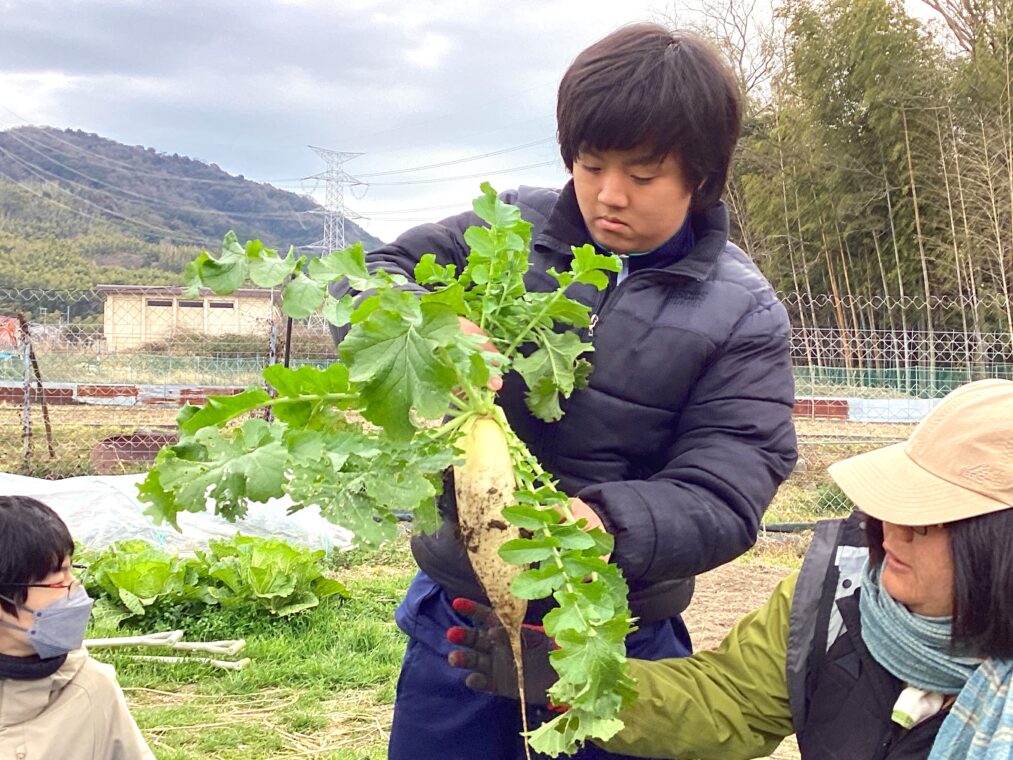 1/21(水)に行う京田辺市役所での製品販売会に向けて、農園芸班の生徒たちが販売する野菜を収穫しました。