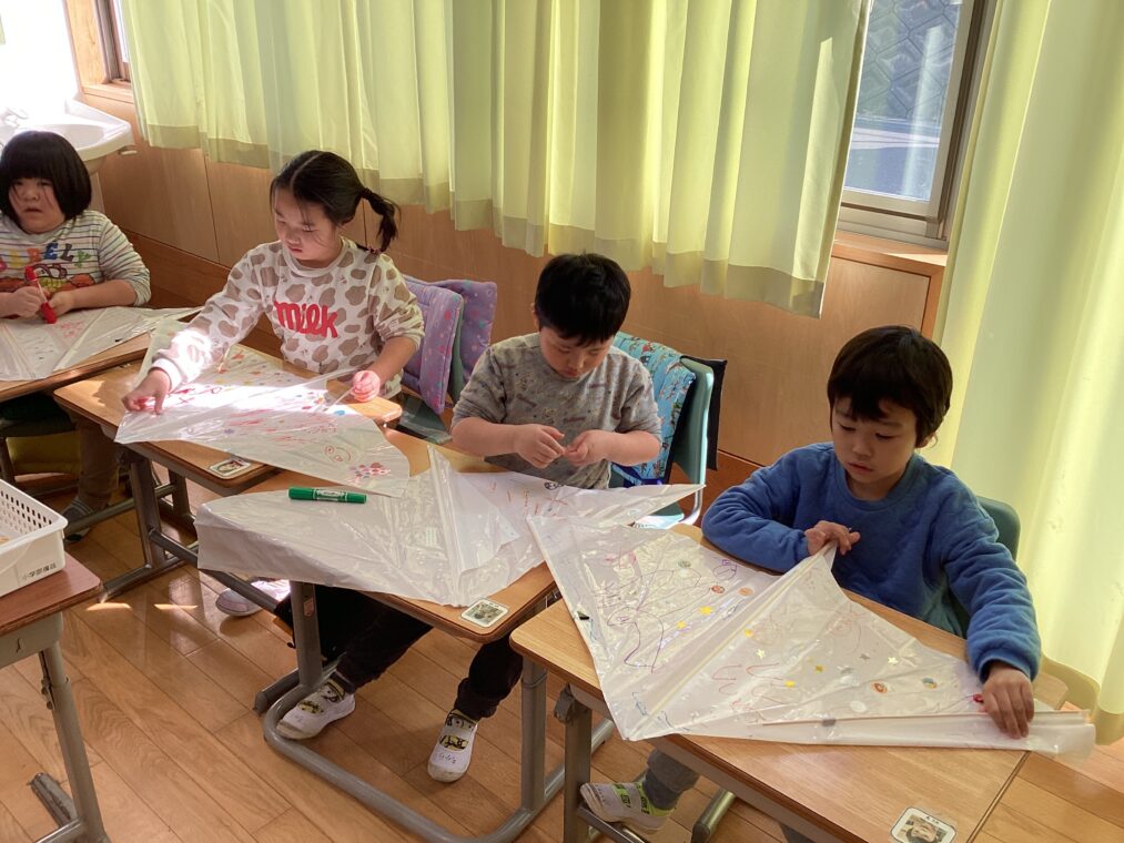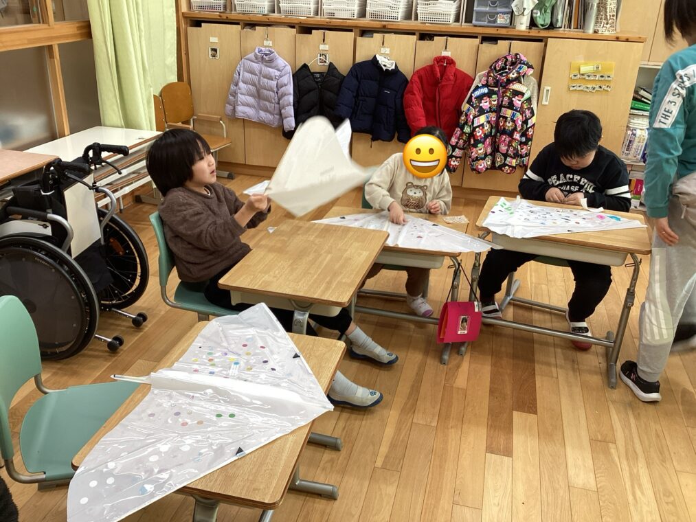 小学部の様子低学年の遊びの指導では、昔あそびに取り組んでいます。5・6組は、自分たちで思い思いに飾り付けをして凧を作り、グラウンドに出て飛ばしました。凧を高く上げようと一生懸命に走ったり、高く上がる凧を見て嬉しそうにしたりする様子が見られました。7・8組は、だるまさんがころんだや福笑いに取り組んでいます。まずは、最初にルールを覚えるところからスタートし、遊ぶ中でだんだんと遊び方に慣れていきました。この後、他の昔遊びにも取り組む予定です。