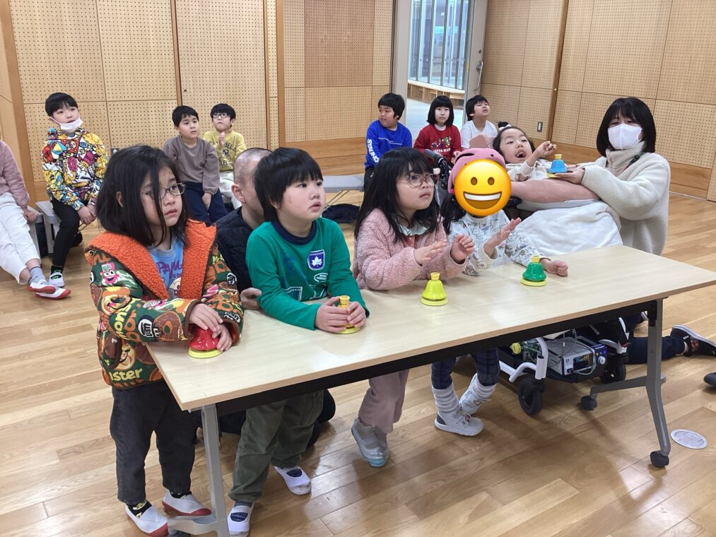 低学年の音楽の授業では、歌や楽器、リトミックなどに取り組んでいます。リトミックでは、音楽に合わせていろいろな動きをしていきます。今回のテーマは動物。ウサギやゾウなどを表現しながら動きます。楽器は、今回はメロディベルを使ってグループで演奏します。自分の担当の音がきたらベルを鳴らします。友達が出す音を聞きながら、タイミングよく鳴らすのが難しいですが、友達と一緒に音を奏でる楽しさがあります。今日は初めての挑戦でしたが、音楽になって聞こえると、嬉しそうな表情が見られました。最後はミラーボールタイムでリラックスして終わります。