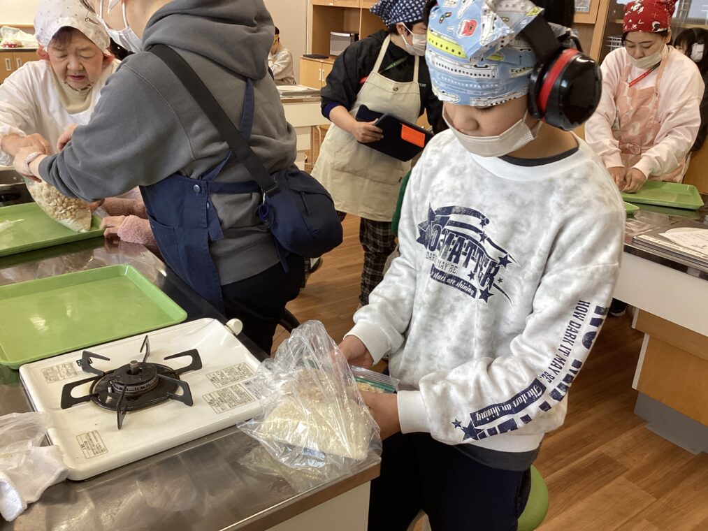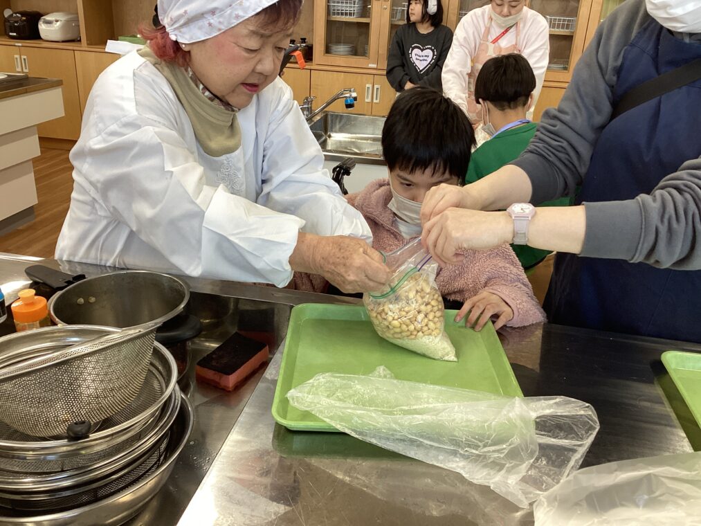 今日は、きょうと食いく先生に来ていただき、5・6年生に味噌づくりを教えてもらいました。味噌づくりに使う大豆は、6月に自分たちで植えて、10月に収穫した大豆です。からから大豆を取り出すところも自分たちでしました。京都しょくいく先生から味噌づくりの手順を教えていただいた後、実際に自分たちで味噌づくりにチャレンジしました。一人ずつ袋に分けて入れてもらっ麹と塩と大豆を、大豆が潰れるようにしながら、混ぜ合わせていきます。潰れていない大豆を見つけたり、偏りなく混ざるようにしたりと根気のいる作業でしたが、集中して頑張っていました。出来上がった味噌は、お家に持ち帰っていますので、是非一緒に食べていただければと思います。