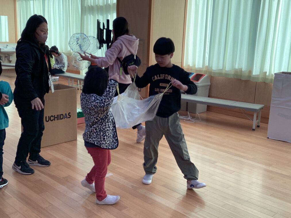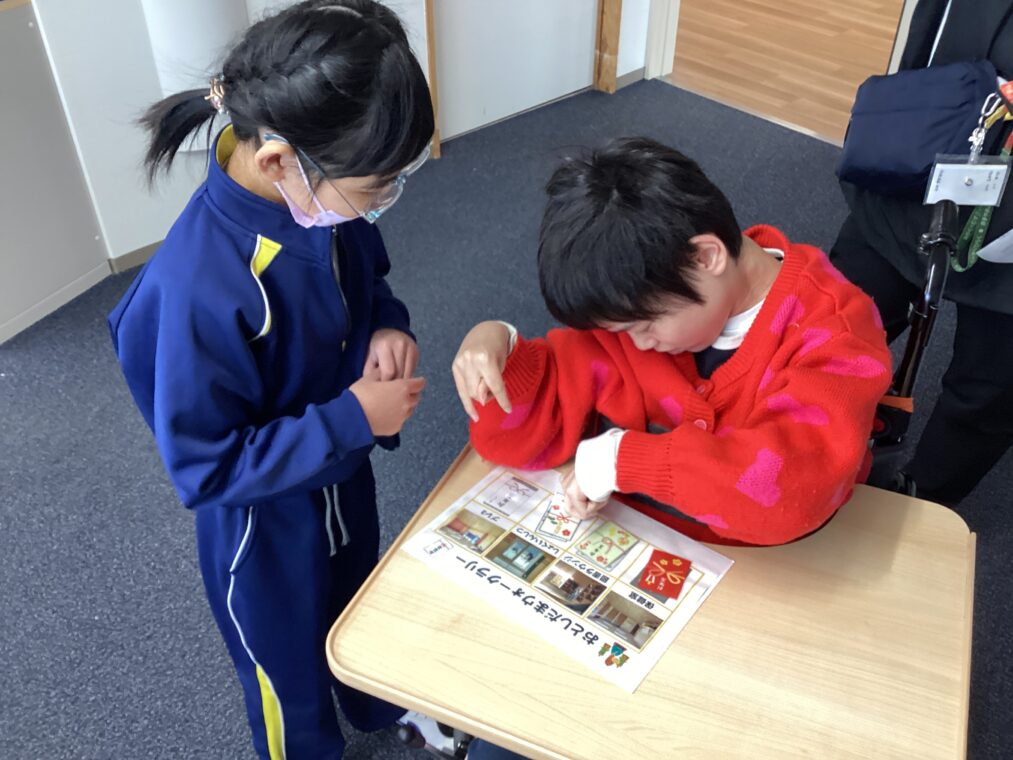 小学部の様子2学期からの取組の学部合同あそびがありました。何回も一緒に活動することで少しずつお互いのことを知り、スムーズに活動ができるようになってきています。校内ウォークラリーをしたグループは、チェックポイントできちんと挨拶をしてお年玉を集めます。ペアで交代しながらもらったお年玉を貼り付けていました。ボール運びをしているグループでは、お互い歩調を合わせてボールを運びます。最後のパラバルーンでは、持つ役をしてくれる人と中に入る人に分かれて楽しみました。クラスを超えての交流も大切な時間です。