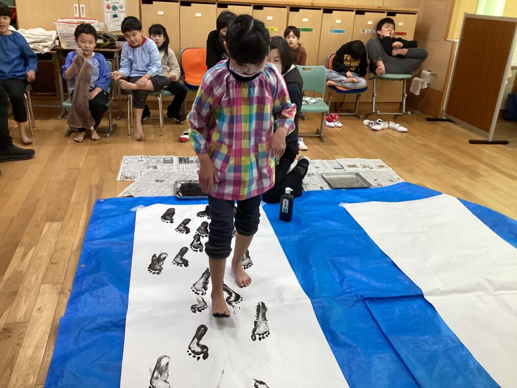 中学年11、12組は、図工の授業で書き初めをしました。筆で字を書く書初めではなく、足の裏に黒いインクを付けて、大きな紙の上を歩き、足跡スタンプの書き初めです。足の裏にインクを付けるのは、くすぐったかったり、ぬるぬるが気持ち悪かったりする児童もいれば、冷っとした感触を楽しんだりぬるぬるを楽しんだりしている児童もいて、感じた方はいろいろでした。足跡スタンプの周りには、いろいろな色で、色付けをしてカラフルに仕上げました。みんなで大きな一つの作品を作り上げました。