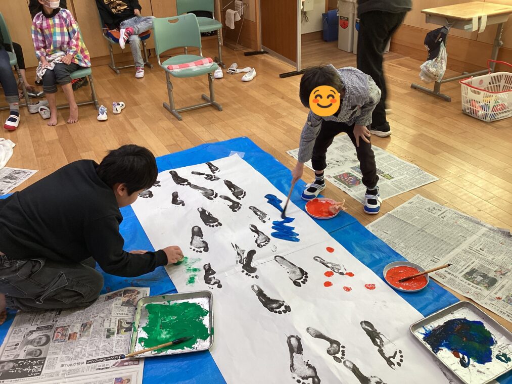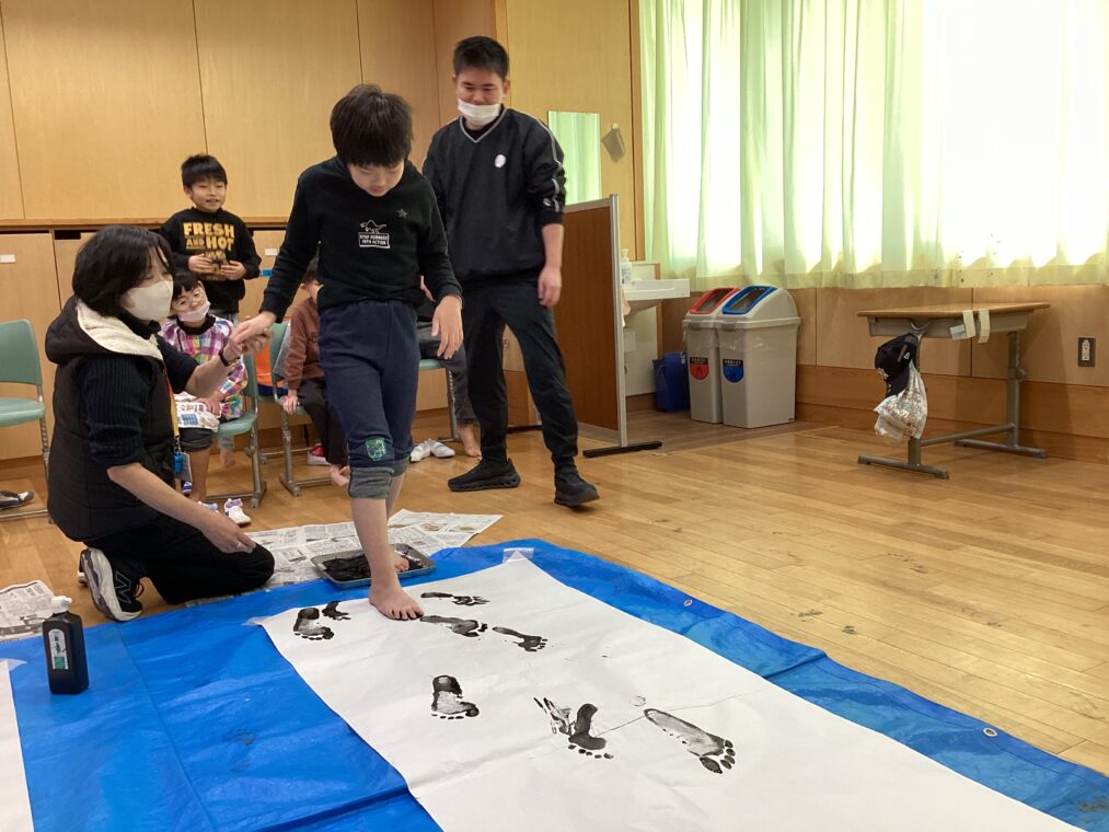 小学部の様子中学年11、12組は、図工の授業で書き初めをしました。筆で字を書く書初めではなく、足の裏に黒いインクを付けて、大きな紙の上を歩き、足跡スタンプの書き初めです。足の裏にインクを付けるのは、くすぐったかったり、ぬるぬるが気持ち悪かったりする児童もいれば、冷っとした感触を楽しんだりぬるぬるを楽しんだりしている児童もいて、感じた方はいろいろでした。足跡スタンプの周りには、いろいろな色で、色付けをしてカラフルに仕上げました。みんなで大きな一つの作品を作り上げました。