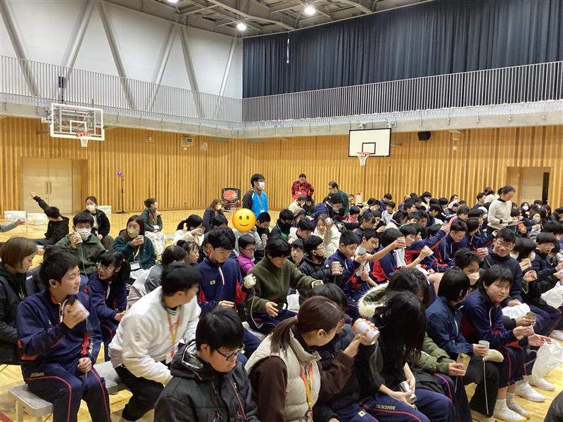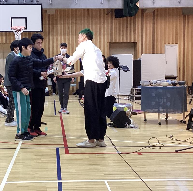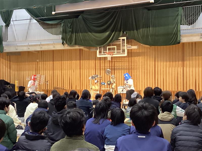 今日は、芸術鑑賞会を行いました。Kajii さんに来ていただき、日用品から生まれた創作楽器を使った演奏を披露していただきました。ペットボトルや廃品を材料にした楽器からは、思わぬふしぎな音が響き、生徒たちは驚きの表情を見せていました。身の回りの物から生まれる音色に触れ、「音楽はこんなに身近なんだ」と感じることができたようです。創意工夫から広がる音の世界に出会い、楽しみながら豊かな感性を育む貴重な時間となりました。