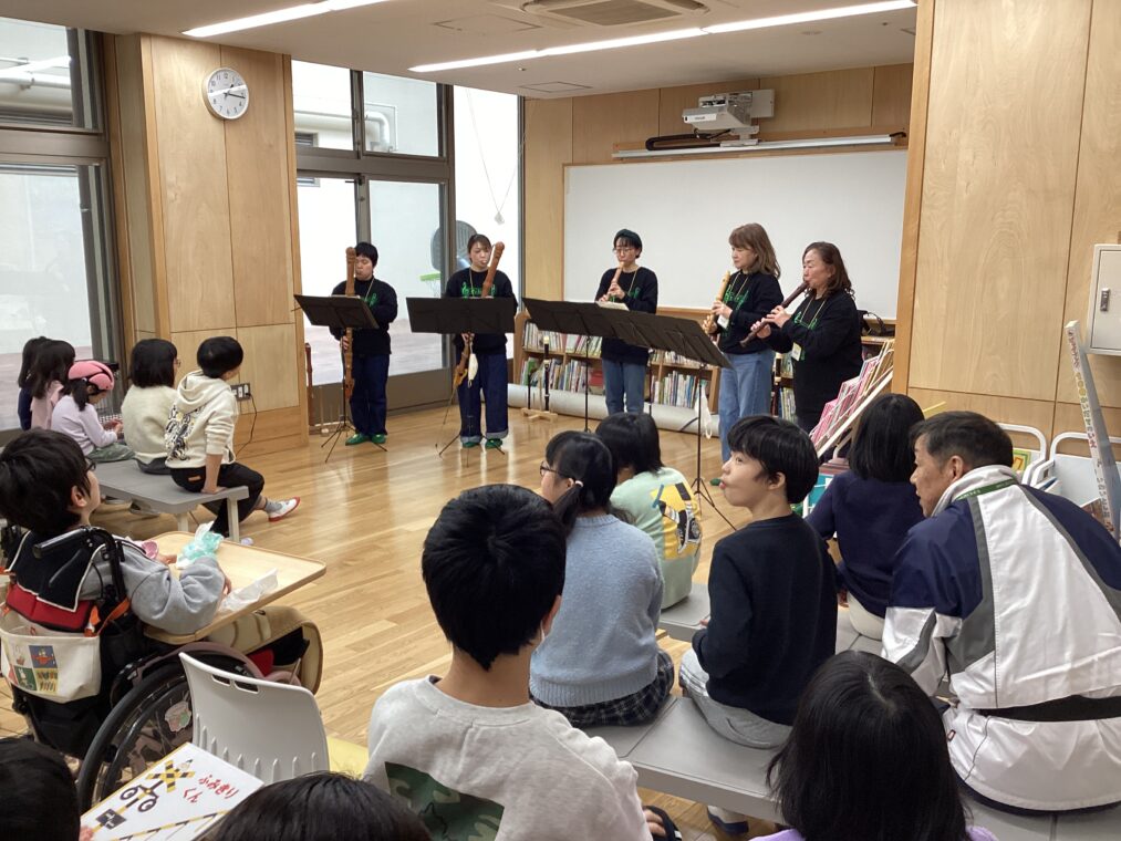 小学部の様子昨日、小学部のこまちサロンがありました。今回は、「トーンカラーズ」のみなさんが来て、大きさのいろいろなリコーダーを使って曲の演奏をしてくださいました。知っている曲が流れると、自然と手拍子したり、体でリズムを取ったりする姿が見られました。最後は、井手やまぶき支援学校の校歌を演奏していただいたので、一緒に歌ったり手話をしたりしながら演奏を楽しむことができました。絵本や音楽の世界を楽しむことができるこまちサロン。いよいよ次回が最終回となります。最終回も楽しみにしています。