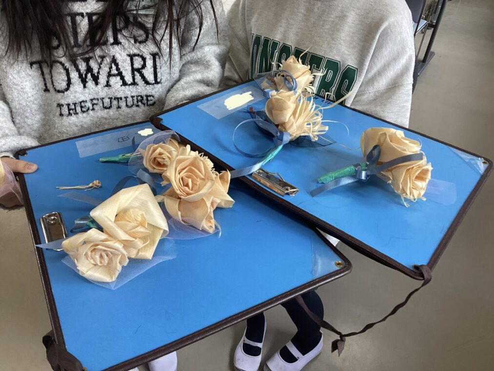 井手小学校では、卒業式の胸花を かんなフラワーで作っています。