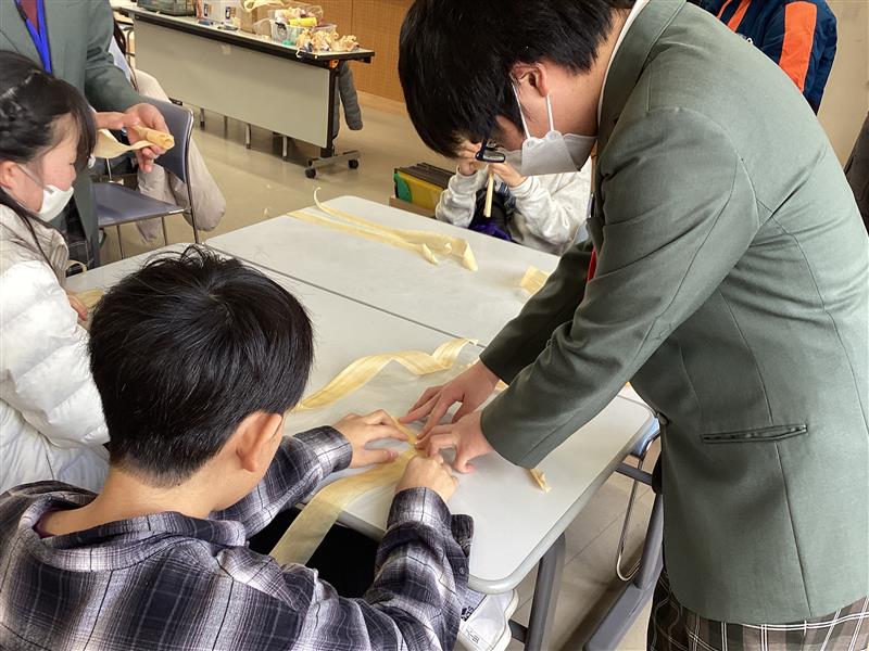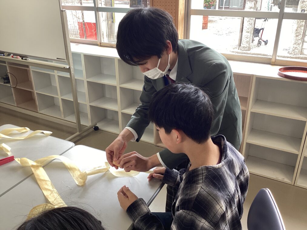 3年生の代表が、井手小学校6年生にかんなフラワー作りを教えに行きました。