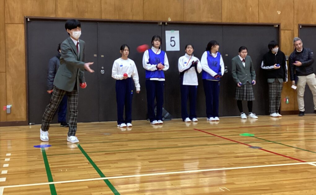 広い体育館いっぱいに複数のコートが設けられ、少人数チームに分かれて田辺高校の生徒の皆さんと一緒にプレーを楽しみました。