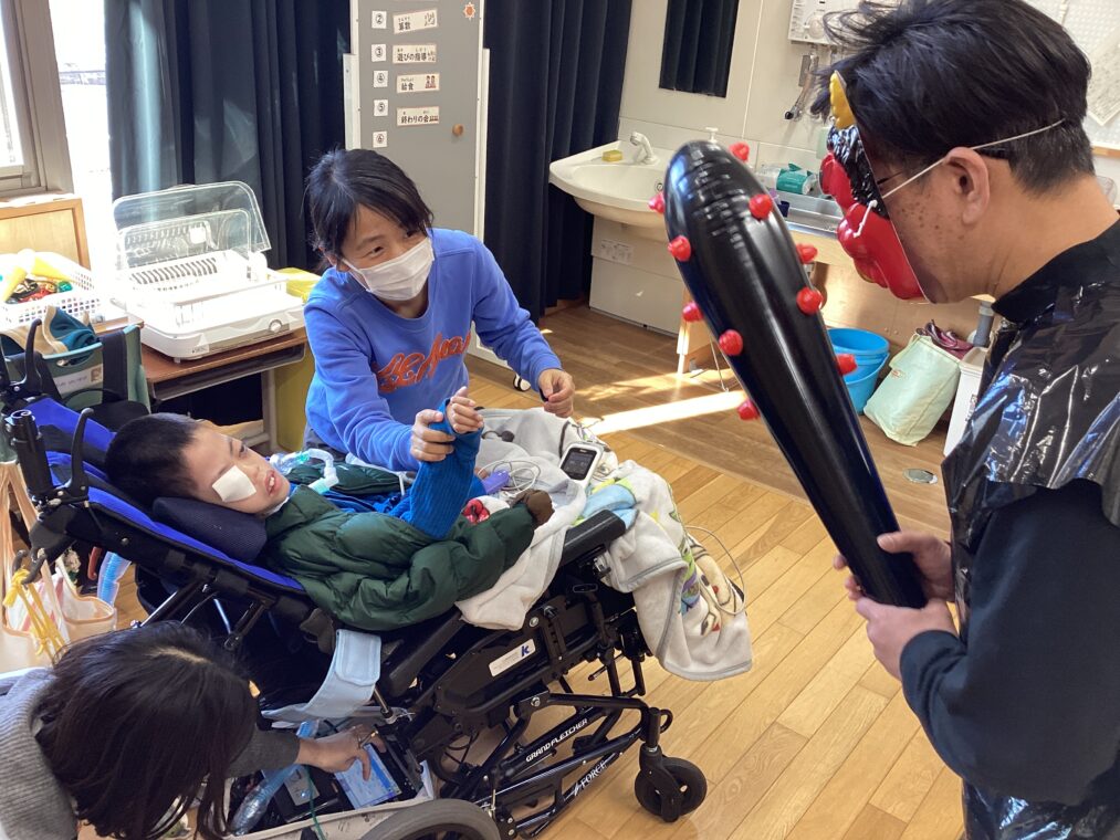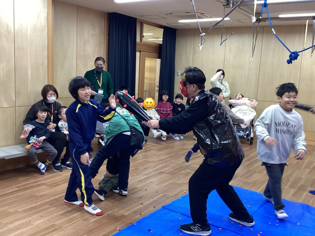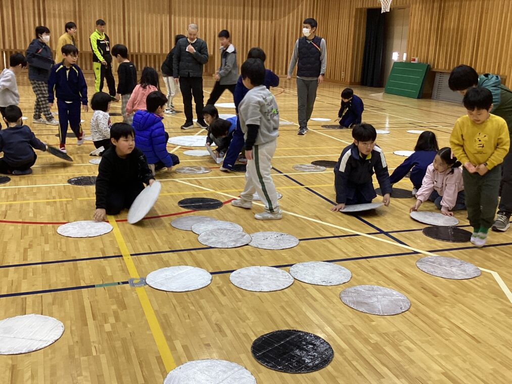 今週も学部合同あそびを行いました。体育館で色板を使った活動をしているグループでは、2つのグループに分かれて、置いてある色板を自分のチームの色にしていきます。ひっくり返したと思ったら相手チームにすぐにひっくり返されたり、ひっくり返すところを狙っていたり、いろいろ作戦を立てながら、目一杯走り回って活動していました。鬼退治をしているグループでは、豆を鬼に投げて鬼退治をします。仲間が鬼に捕まると、怖さを我慢して鬼に向かって豆を投げる児童の姿が見られました。残り数回もみんなで楽しみましょう。