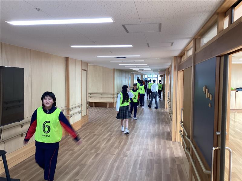 中学部の様子今日の昼休みは、高等部が提案してくれた「歩き鬼ごっこ」を楽しみました。逃げる人は2人で手をつなぎ、走らずに3階の廊下をゆっくり移動します。声をかけ合いながら逃げて、ドキドキしながら逃げている姿がとても印象的でした。みんな笑顔で、高等部との交流を楽しんだ時間を過ごすことができました。