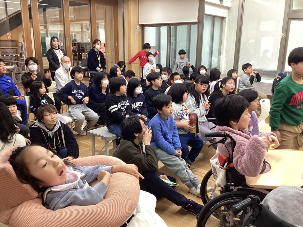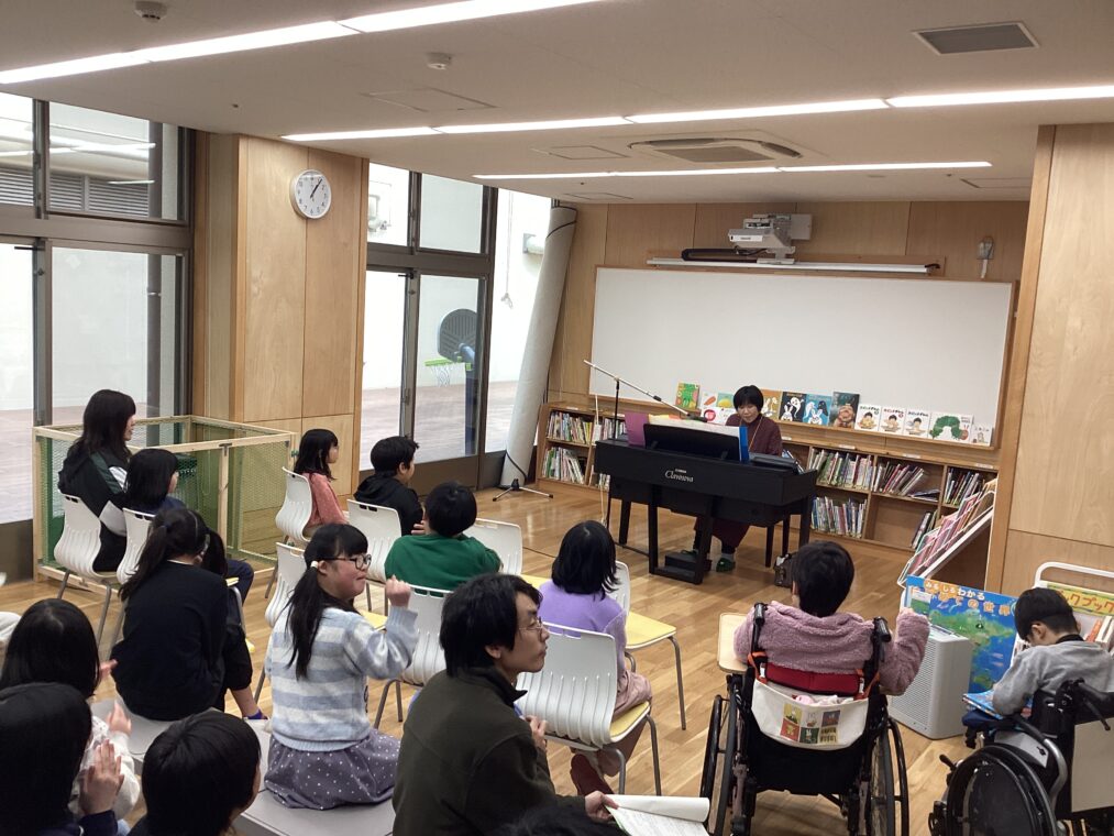 小学部の様子今日は、今年度最後の小学部こまちサロンでした。きらきらランド講師の脇本美公子様に来ていただき、ピアノ演奏に合わせての弾き語りで歌を披露していただきました。事前に児童の好きな曲を尋ねてくださったことで、当日は子どもたちに馴染みのある曲をたくさん演奏してくださいました。知っている曲が流れると、自然と口ずさんだり手拍子をしたりと、音楽に合わせて思い思いに参加する姿が見られました。一年間いろいろな方に来ていただいたこまちサロン。ありがとうございました。