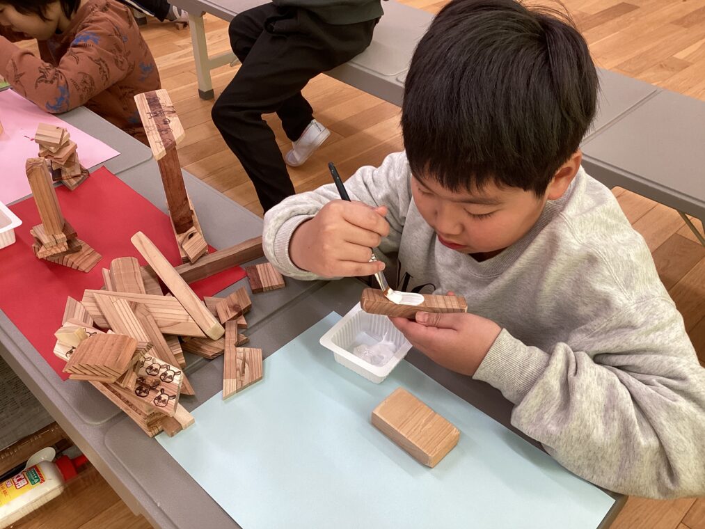 小学部の様子中学年の遊びの指導の学習で、「もっこうランド」に取り組んでいます。高等部から使わない木材を分けてもらい、まず最初は紙やすりで木を磨きました。次に、いろいろな形の木材から自分が好きな木材を選んで、もっこうボンドでくっつけながら、思い思いに組み立てていきます。最初からイメージしながら組み立てていたり、くっつけていく中でイメージを膨らませていったりと作り方も児童それぞれです。木の木目や手触りなど、自然の素材を感じながら、世界に一つだけの素敵な作品に仕上がってきています。