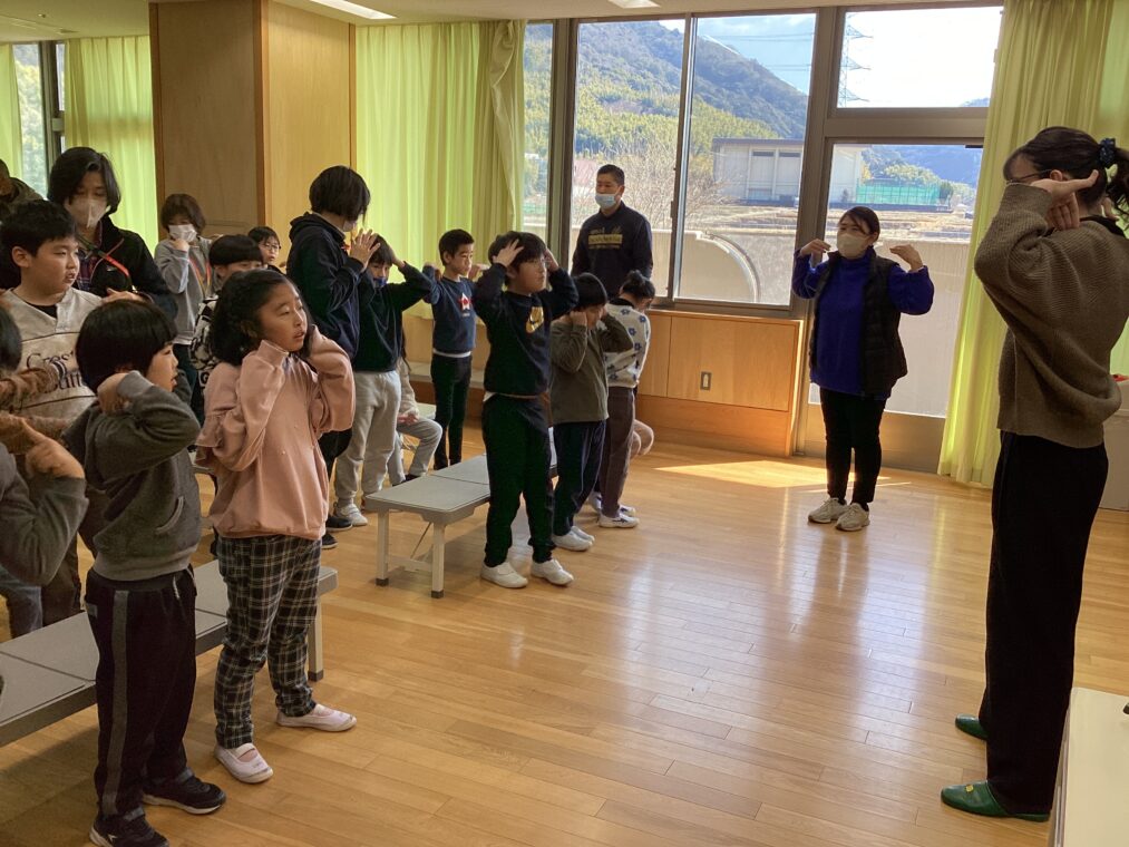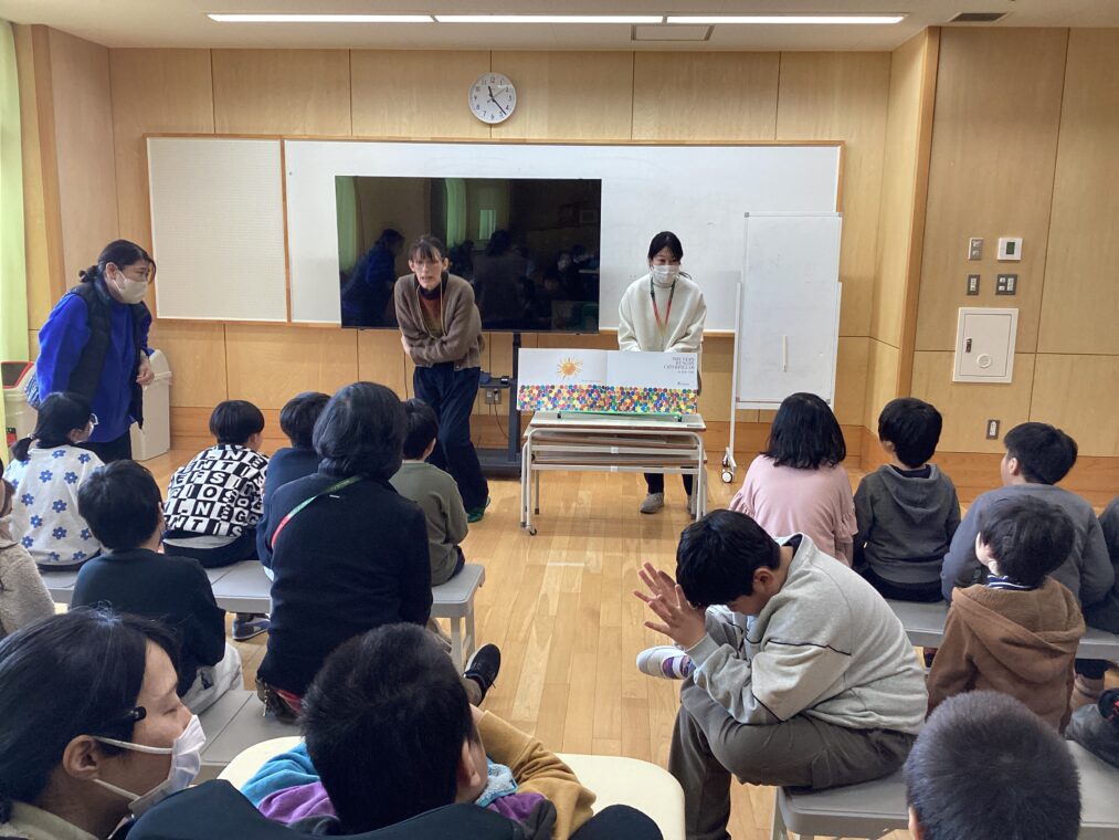 小学部の様子ALTのエブリン先生に来ていただき、中学年、高学年に英語で読み聞かせをしてくださいました。最初に英語の歌を一緒に歌ったり体を動かしたりして、英語に親しみました。その後、2冊の絵本を英語で読み聞かせをしてもらいました。同じフレーズが繰り返し出てくる内容だったので、聞いているうちに子どもたちもそのフレーズを一緒に呟いたり、手振りを一緒にしたりと楽しむことができました。