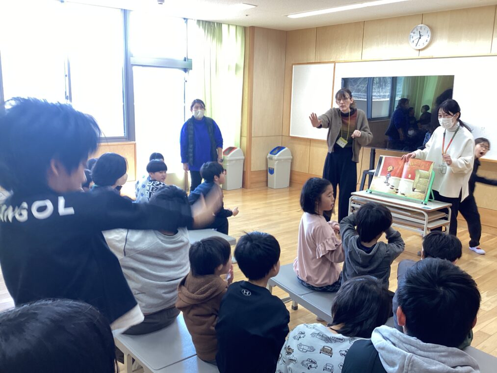 ALTのエブリン先生に来ていただき、中学年、高学年に英語で読み聞かせをしてくださいました。最初に英語の歌を一緒に歌ったり体を動かしたりして、英語に親しみました。その後、2冊の絵本を英語で読み聞かせをしてもらいました。同じフレーズが繰り返し出てくる内容だったので、聞いているうちに子どもたちもそのフレーズを一緒に呟いたり、手振りを一緒にしたりと楽しむことができました。