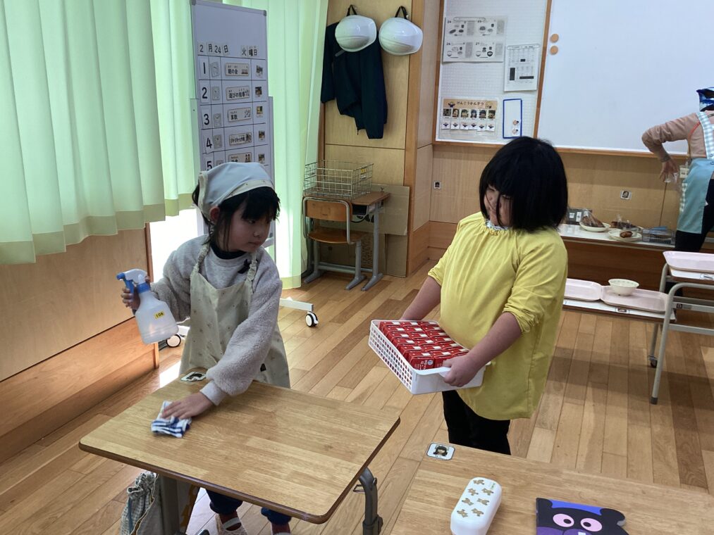 給食の時間になると、子どもたちは手洗いをしたり、エプロンや三角巾を着けたりと、自分で身支度をして待ちます。一年をとおしてだんだんと一人で準備できることが増えてきています。クラスによっては、児童も配膳の準備を手伝っています。ワゴンを運んだり、配膳室でワゴンに移し替えたり、牛乳やストローなど数がわかりやすいものを配ったりと内容もさまざまです。準備が終わったら、みんなでおいしい給食をいただきます。