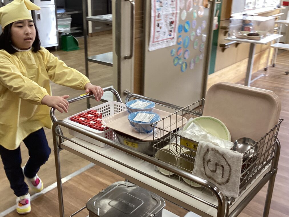 小学部の様子給食の時間になると、子どもたちは手洗いをしたり、エプロンや三角巾を着けたりと、自分で身支度をして待ちます。一年をとおしてだんだんと一人で準備できることが増えてきています。クラスによっては、児童も配膳の準備を手伝っています。ワゴンを運んだり、配膳室でワゴンに移し替えたり、牛乳やストローなど数がわかりやすいものを配ったりと内容もさまざまです。準備が終わったら、みんなでおいしい給食をいただきます。