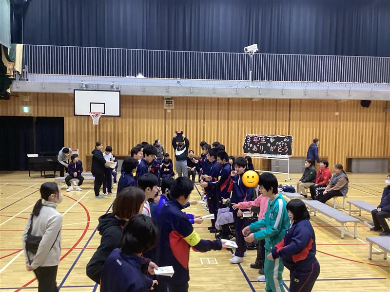 本日、中学部集会として「卒業を祝う会」を行いました。レクリエーションでは、全員でじゃんけん列車を楽しみ、笑顔あふれる時間となりました。その後、1・2年生から3年生へ感謝の気持ちを込めたプレゼントが渡され、3年生からは在校生へ心温まるメッセージが贈られました。楽しい時間の中にも、卒業が近づいていることへの寂しさが感じられ、会場は温かい雰囲気に包まれました。最後に3年生が合唱を披露し、そのまっすぐな歌声に思わずウルっとなり感動させられました。卒業までの残りの日々も、共に大切に過ごしていきたいと思います。