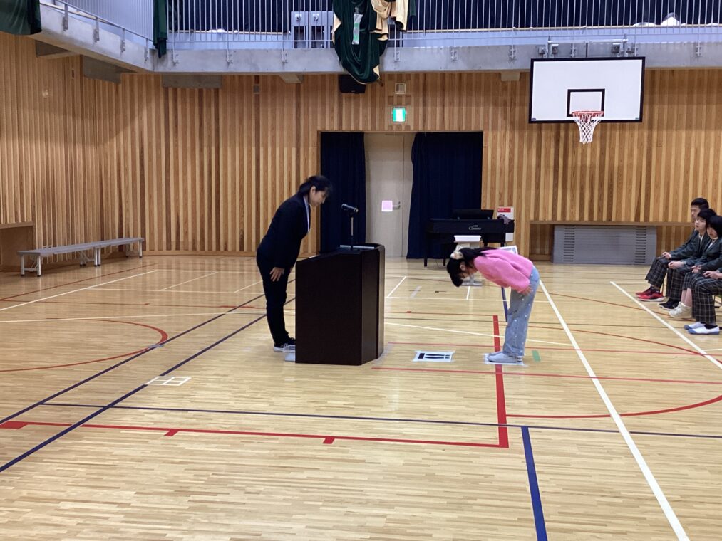 卒業式に向けて練習が始まっています。小学部6年生と中学部3年生と合同で体育館で練習をしています。これまでの学びをしっかりと形にできるよう、一人一人が気持ちを込めて取り組んでいます。1回目は、入退場の歩く姿勢や早さの確認を、証書授与の動きの確認や証書受け取り方の確認を行いました。2回目は、1回目の流れを再確認して、全員での起立のタイミングや礼のタイミングを確認しました。緊張しながらも、真剣な表情で取り組む姿から、卒業を迎える実感が少しずつ高まっている様子が感じられています。