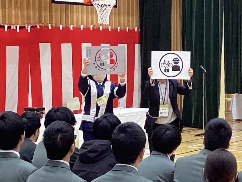 高等部の様子京都府田辺警察署で取り組まれている自転車駐輪場の防犯環境整備ピクトグラム表示の第2弾として、ヘルメット着用と鍵かけを呼びかける「ヘル&ロック」のデザインを募集され、みらいデザインコースの生徒のアイデアが見事採用されました。