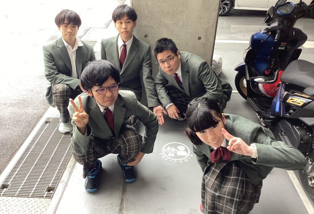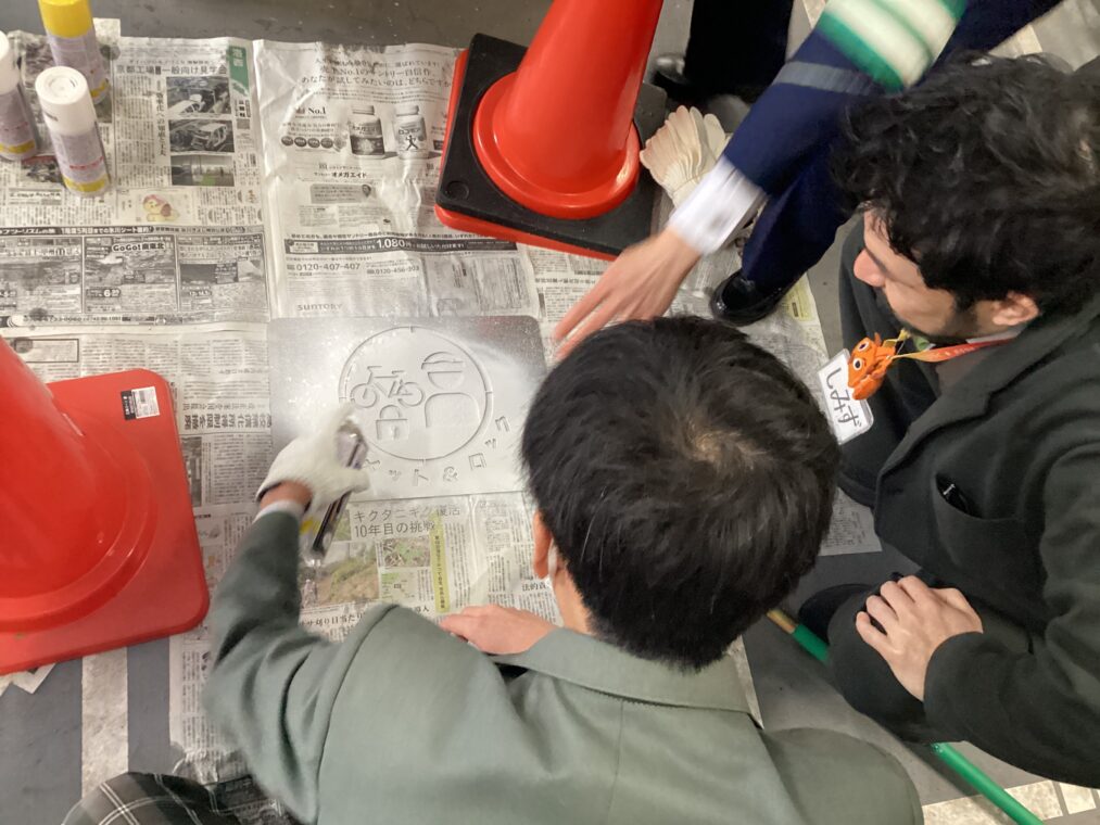 今日は交通安全課と生活安全課の方が来校され、路面にペイントするときに使用するプレートを披露してくださり、生徒とともに本校の駐輪場に記念ペイントを行いました。