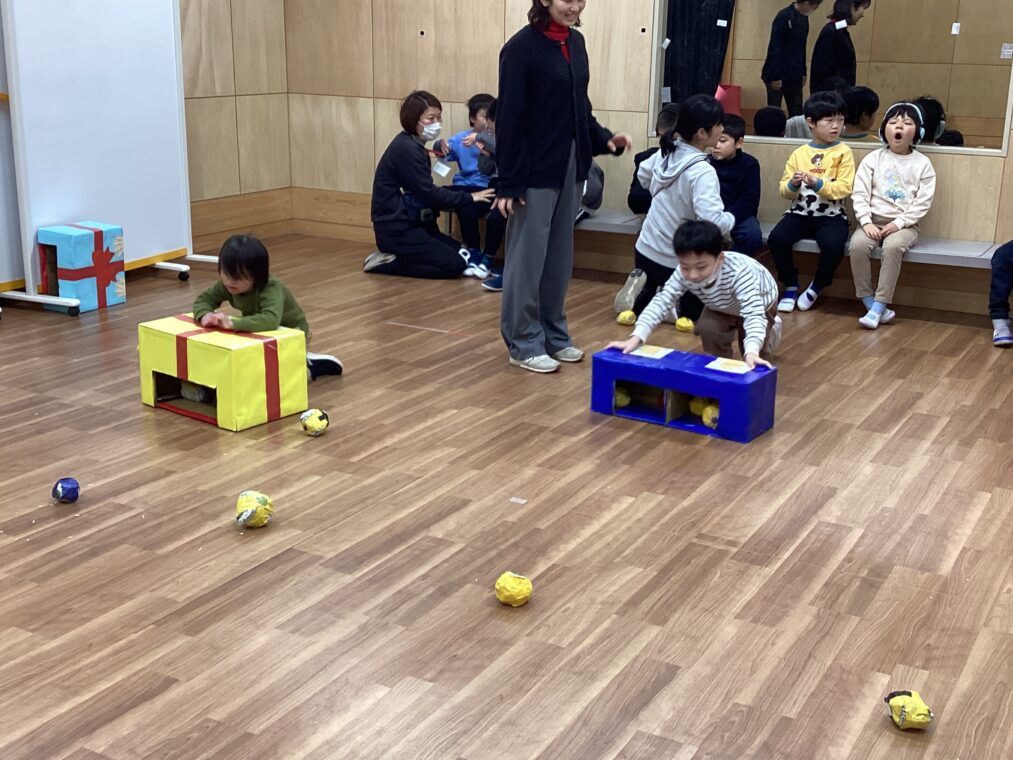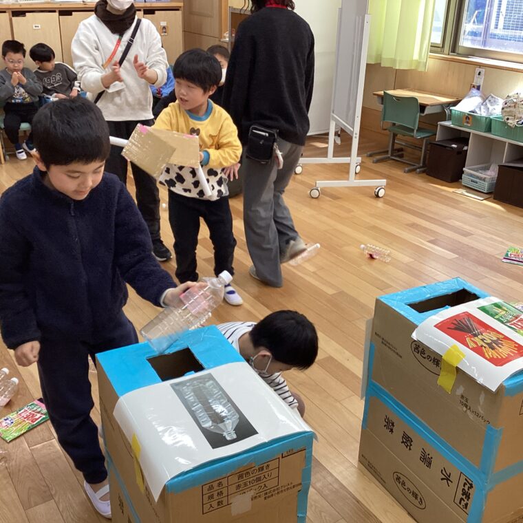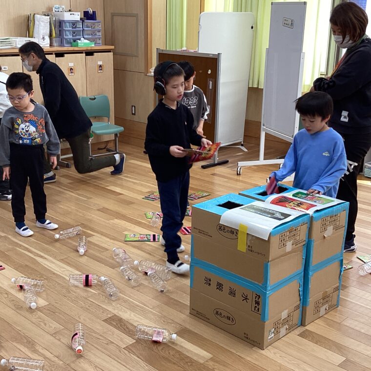 低学年の遊びの指導で取り組んでいる「ぴかぴか大作戦」。1・3組では、ぞうきんがけ遊びと分別遊びに取り組みました。箱ぞうきんを使って教室に落ちているゴミをきれいに集めたり、落ちているゴミを拾い、ペットボトルか紙のゴミかを分別してゴミ箱に入れたりします。回数を重ねるごとにだんだん上手にできるようになりました。普段の生活にも繋がっていくことを期待しています。